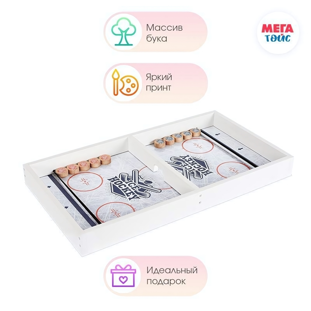Игровое поле изготовлено из массива бука – экологичного и долговечного материала. Яркий дизайн с фирменным логотипом 'Hockey' добавляет игре привлекательности. Комплект включает шайбы двух цветов для удобства игры.