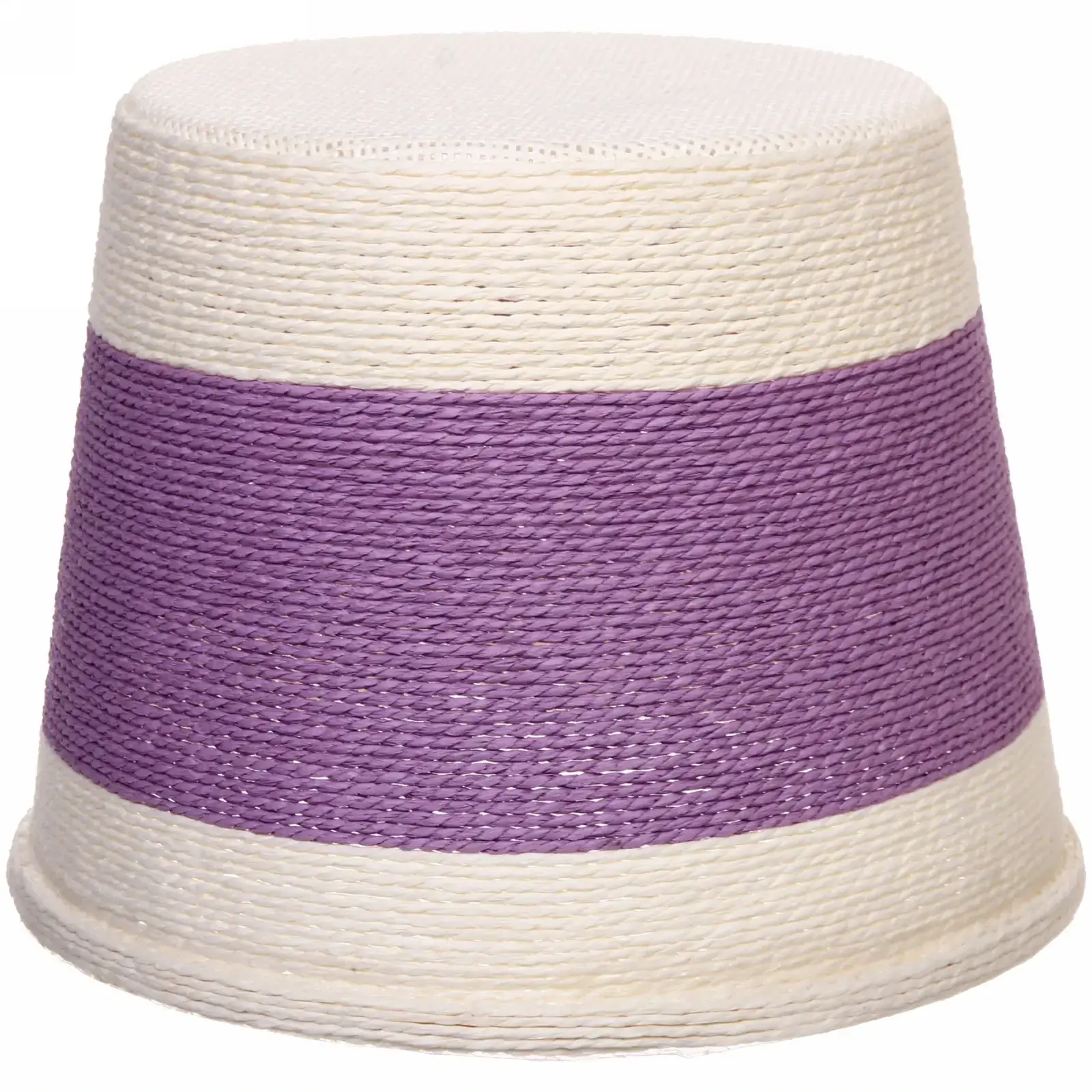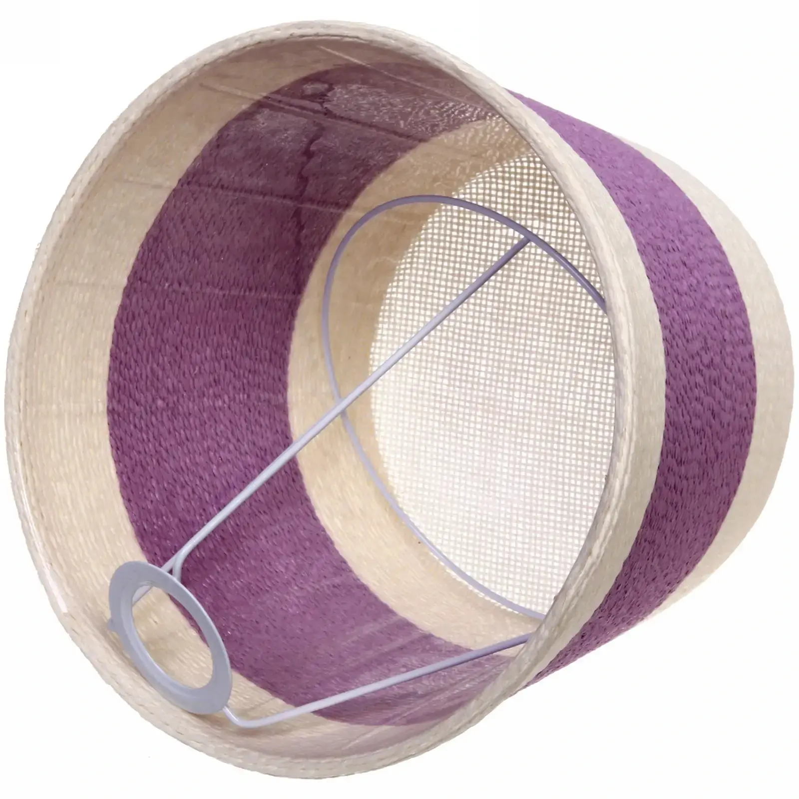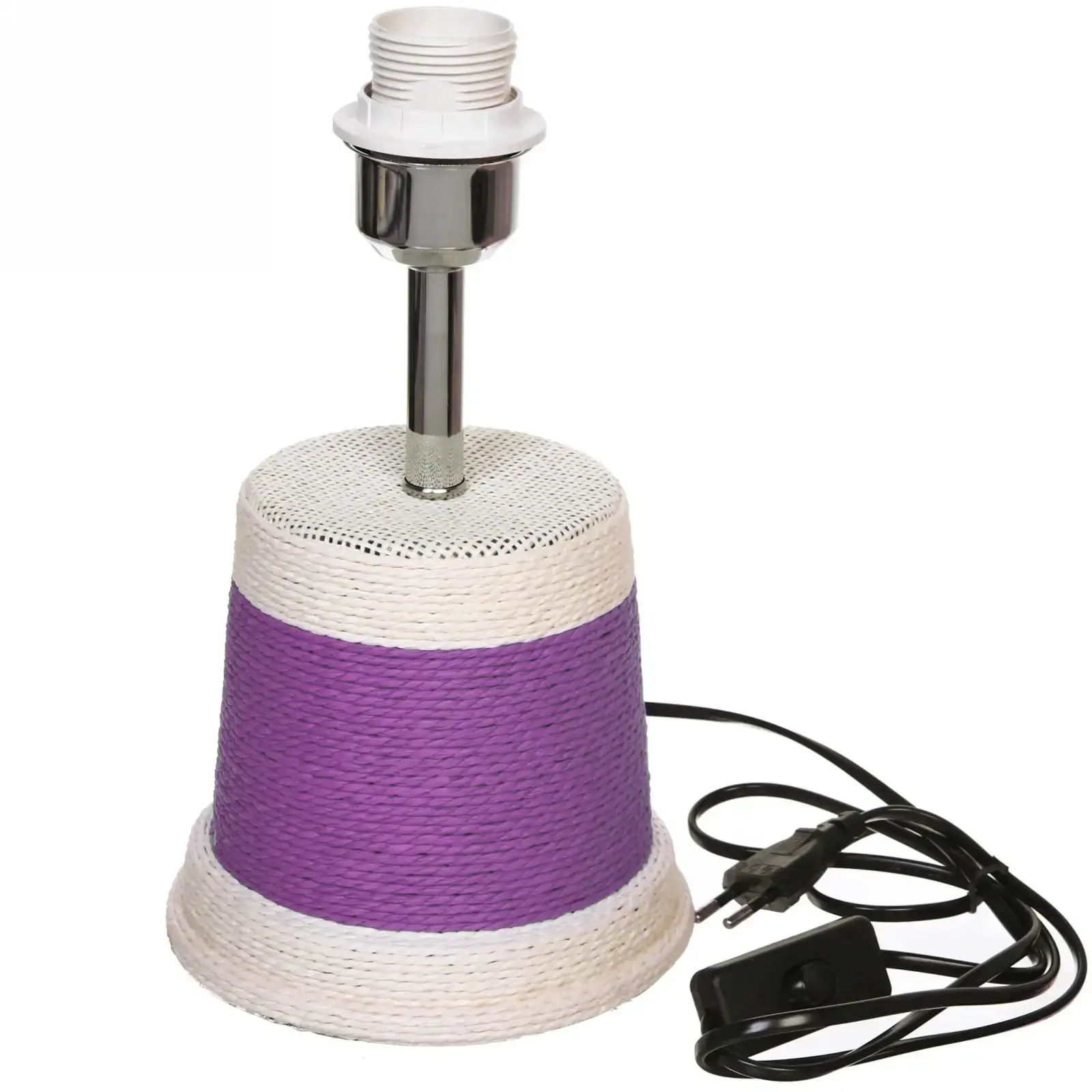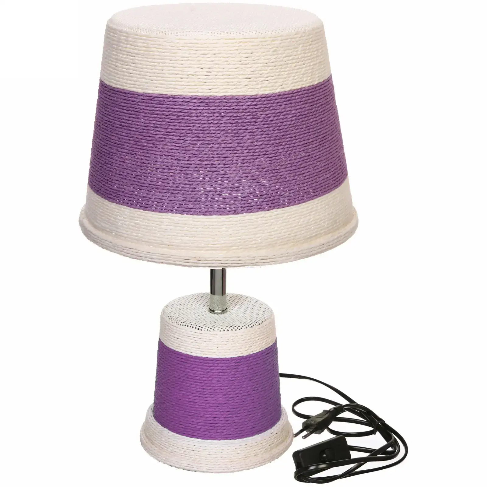 Комбинация прочного металла и экологичного джута обеспечивает долговечность изделия. Белые и фиолетовые акценты добавляют элегантности, а двухслойный абажур равномерно распределяет свет.
