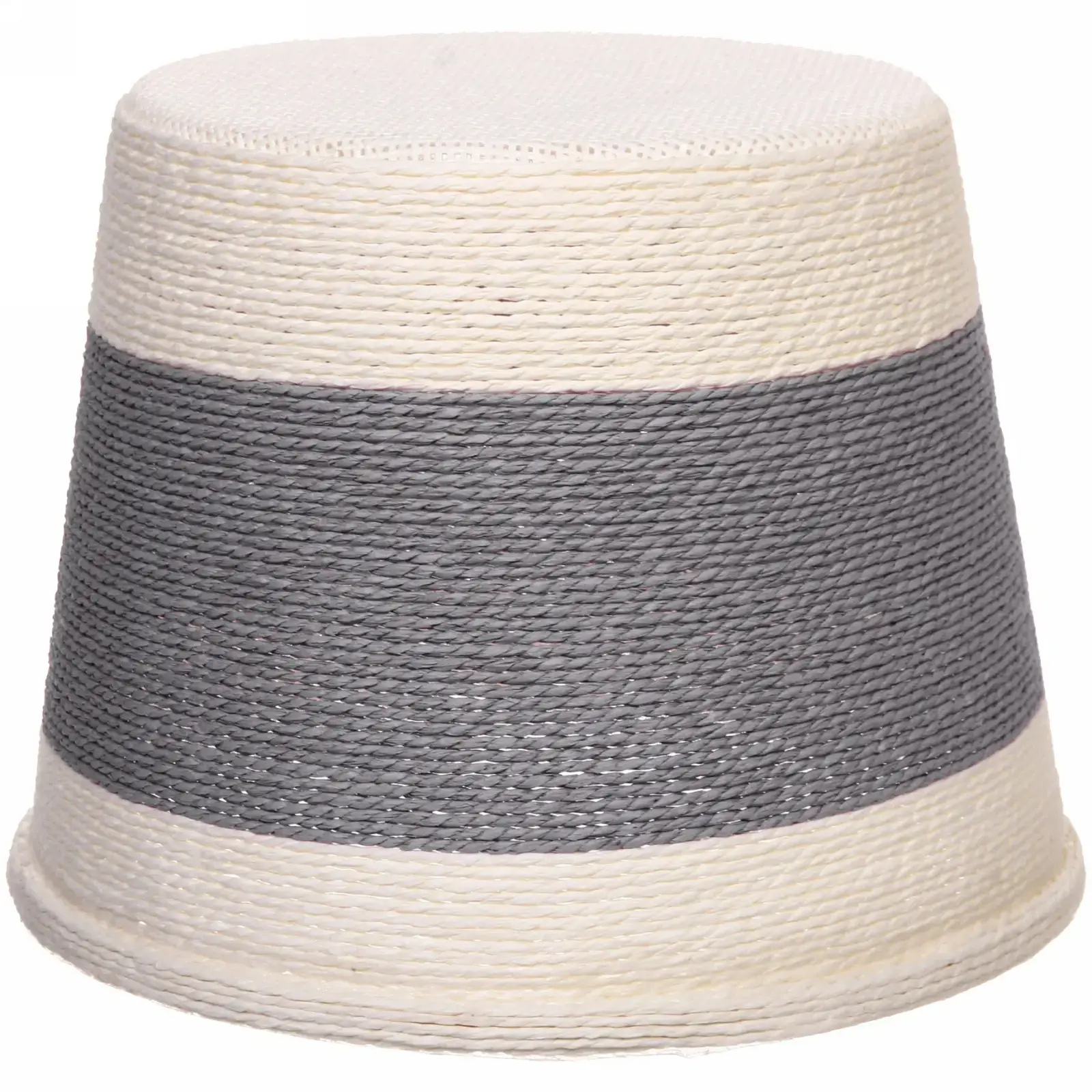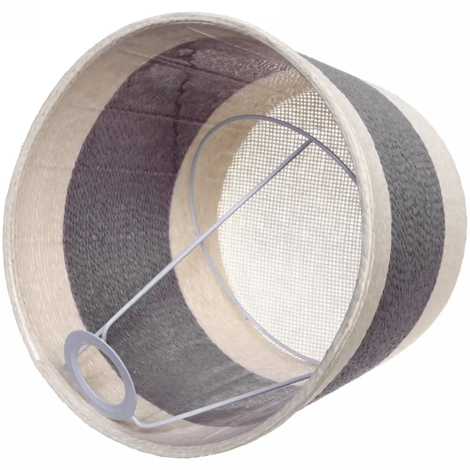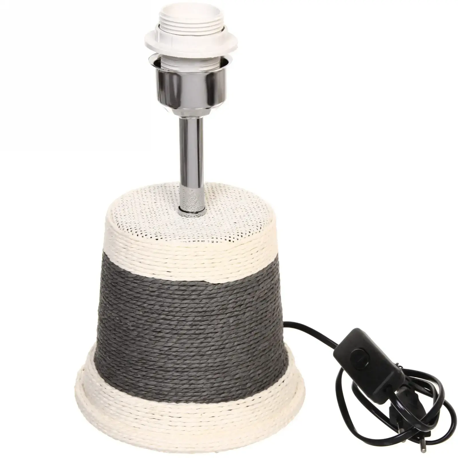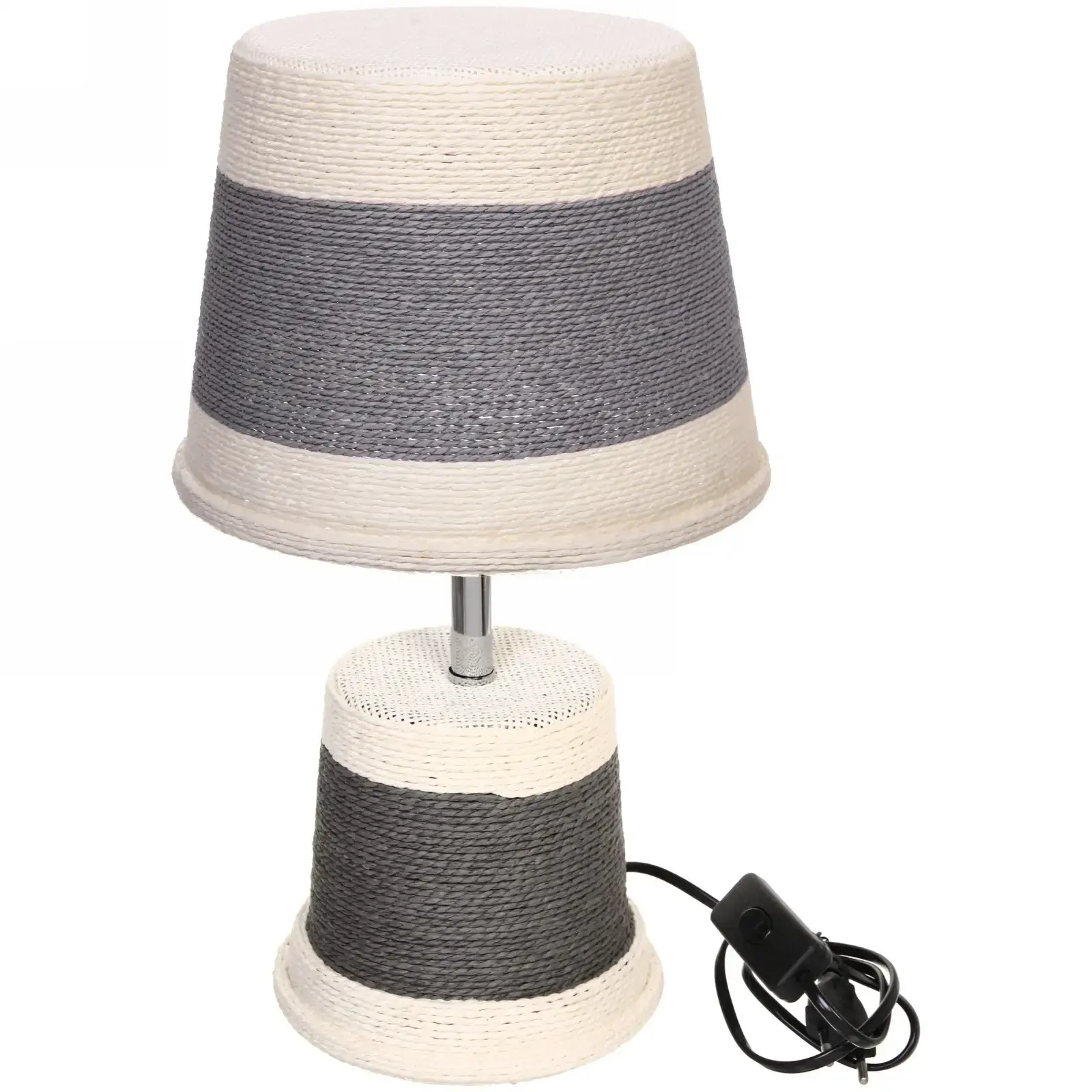 Лампа выполнена из качественных материалов: джута, металла и пластика, что гарантирует её долговечность и надежность. Конусообразный абажур из текстиля с белой и серой полосой создает мягкий, рассеянный свет, который не напрягает глаза. Цилиндрическое основание добавляет устойчивости и стиля, а металлическая опора обеспечивает надежность конструкции.