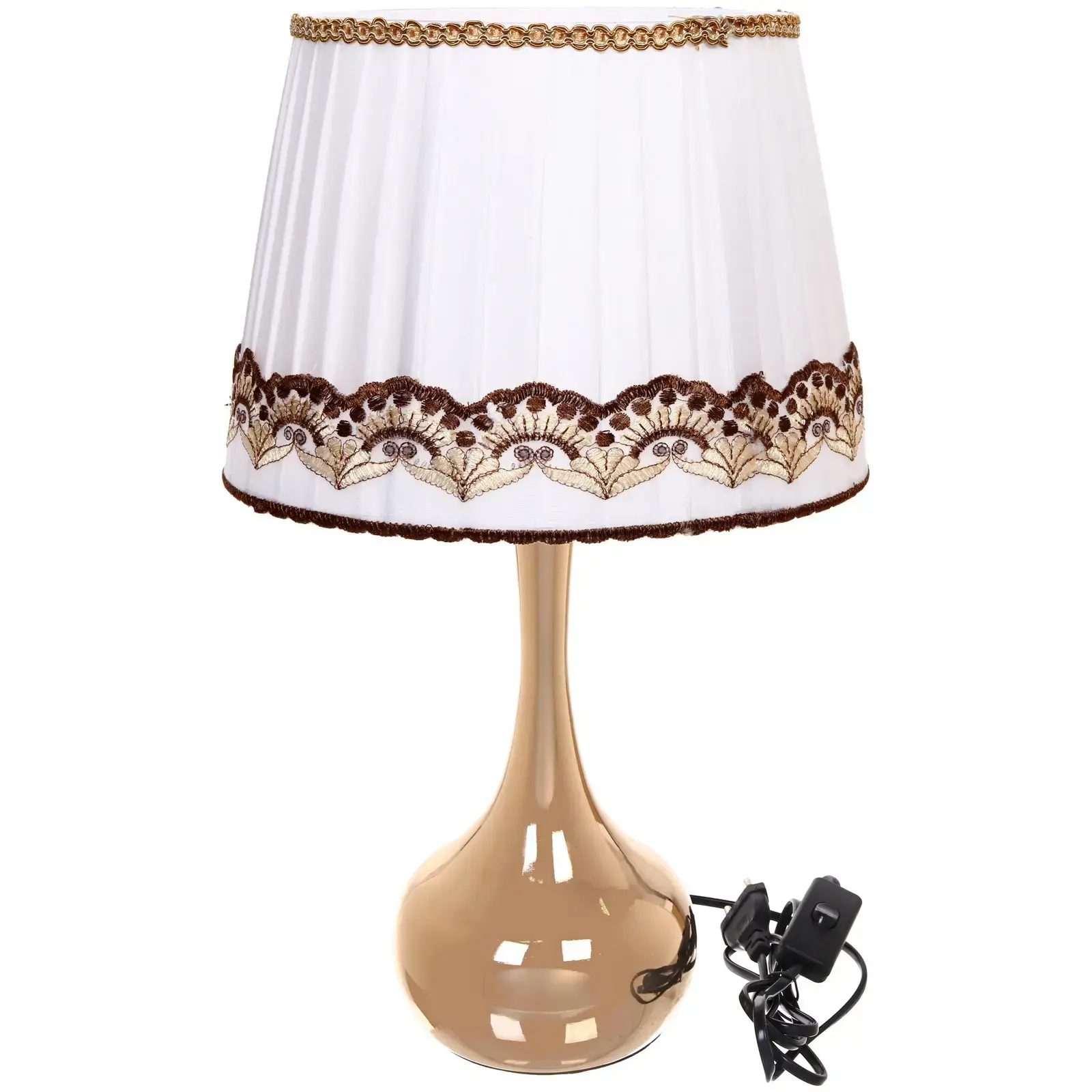 Лампа имеет мощность 1*40Вт, что обеспечивает достаточное освещение для различных задач. Белый абажур с вертикальными складками и золотистой цепочкой придает изделию уникальный вид. Округлая основа выполнена в светло-коричневом цвете, что делает лампу универсальной для сочетания с другими предметами интерьера.