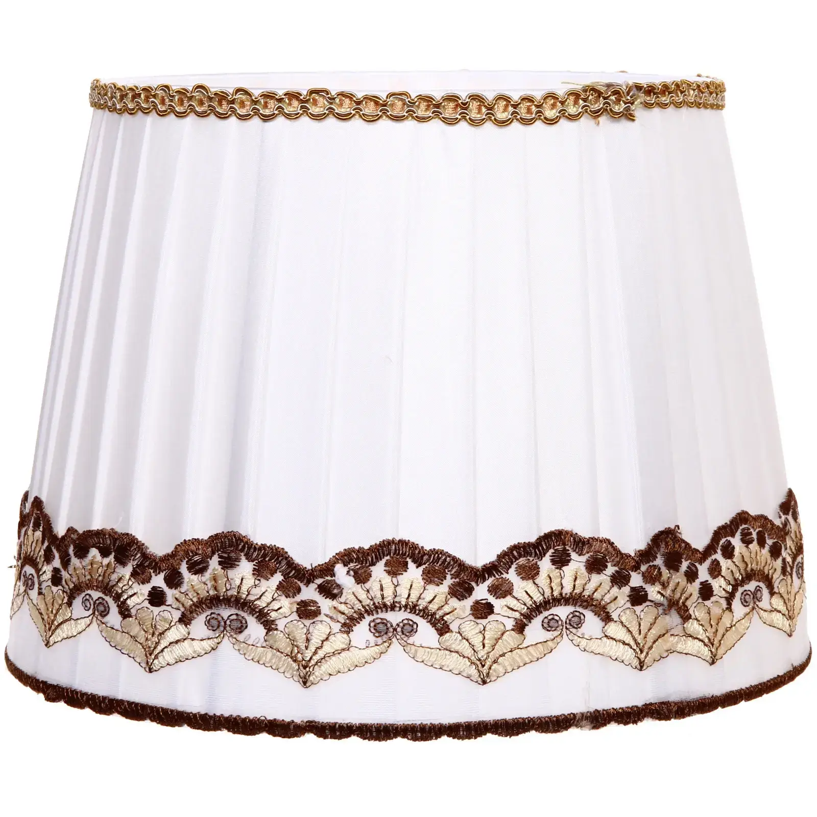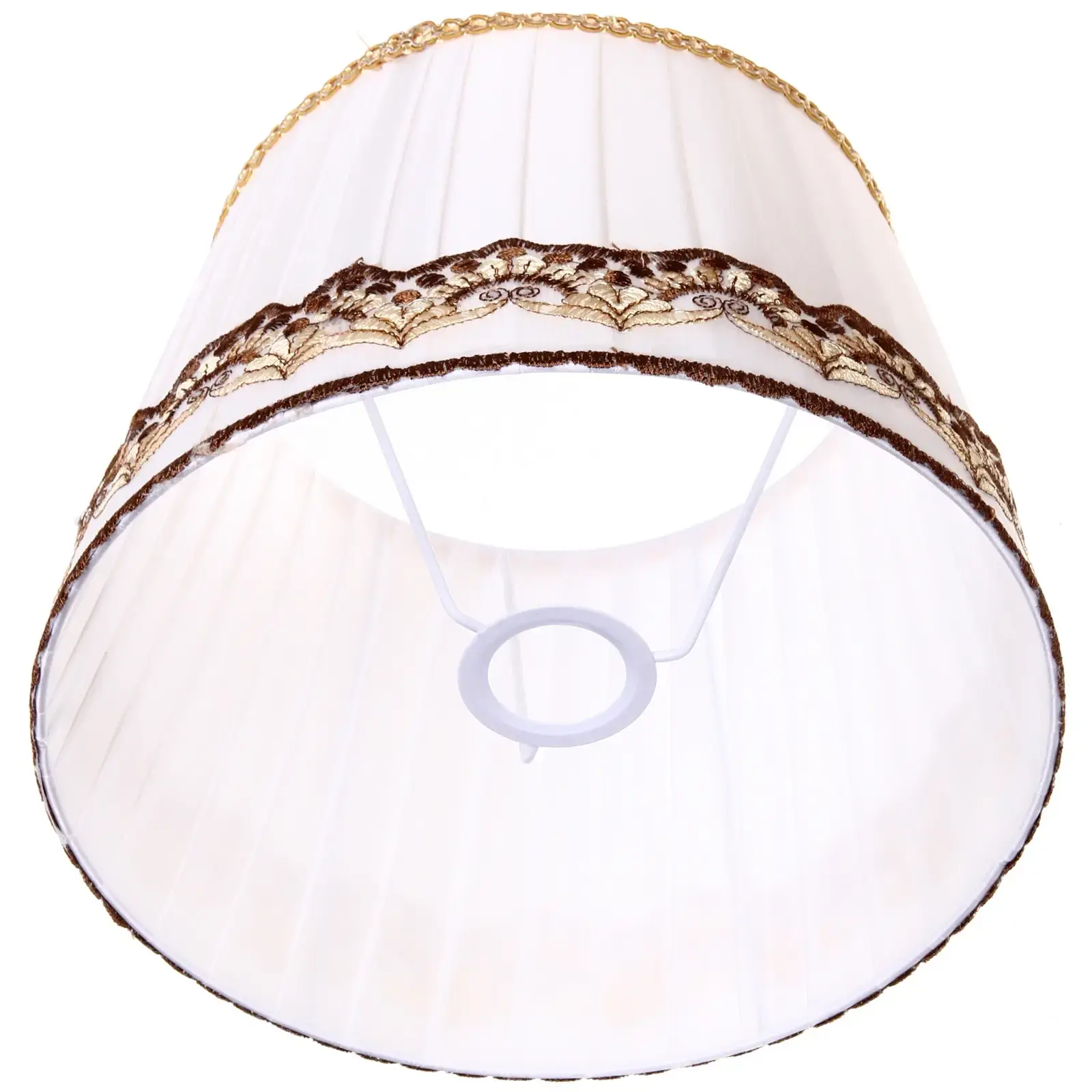 - Элегантный дизайн с белым текстильным абажуром и золотистой отделкой.