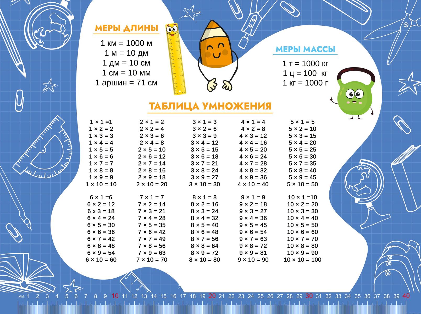 На поверхности размещена полная таблица умножения от 1 до 10, а также блоки с мерами длины и массы. Это делает покрытие полезным для учеников начальной школы: во время выполнения домашних заданий ребёнок может быстро найти нужное значение, не отвлекаясь на поиск в учебнике.