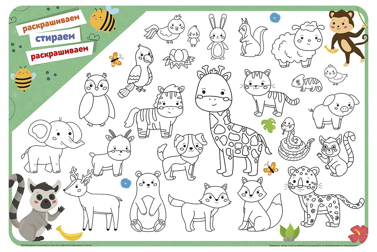 Покрытие имеет оптимальный размер 43х64 см, что обеспечивает надежную защиту большой площади рабочего стола от загрязнений, жирных пятен пластилина и царапин. На белом фоне расположены детальные контурные изображения множества животных в дружелюбном мультяшном стиле: здесь вы найдете жирафа, зебру, слона, хитрых лисиц, медвежат и даже экзотического лемура. Процесс раскрашивания мелких элементов отлично развивает мелкую моторику, концентрацию внимания и цветовое восприятие у детей разного возраста.