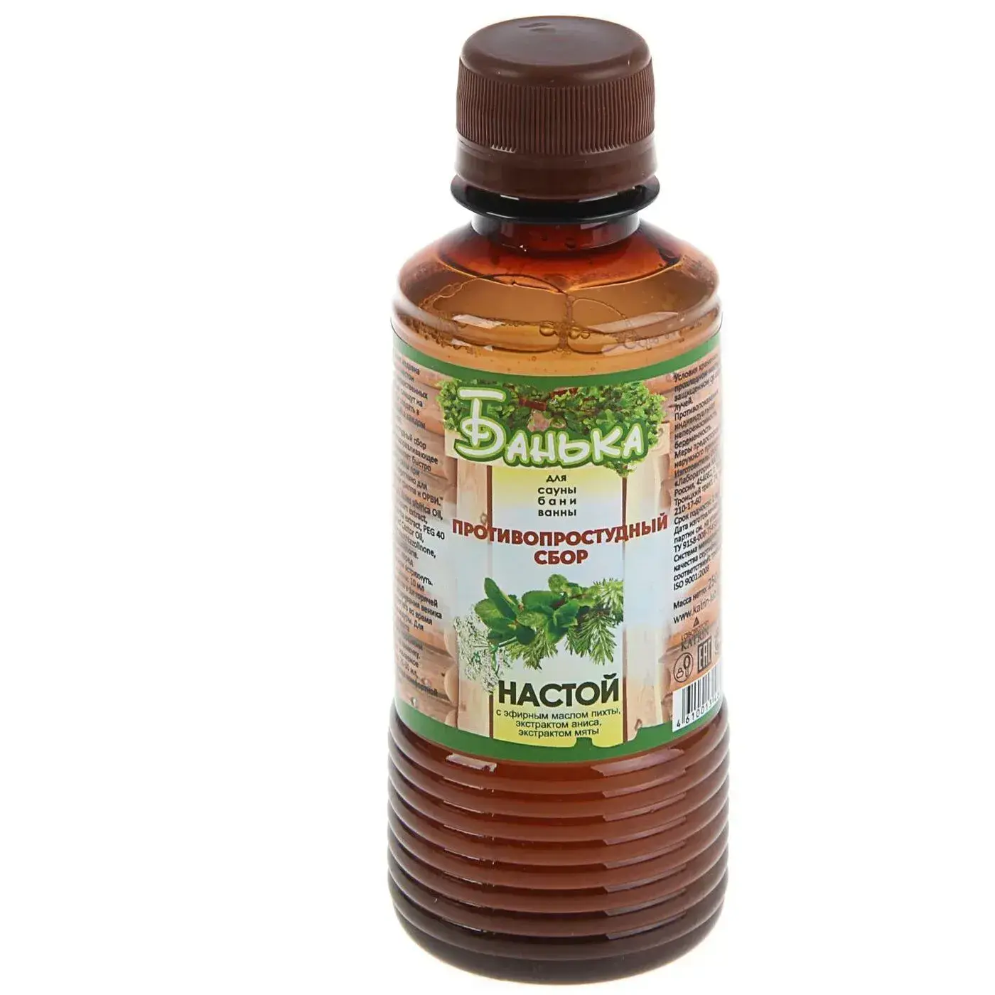 Объем бутылки составляет 250 мл, что позволяет использовать настой несколько раз. Упаковка выполнена из прозрачного пластика коричневого цвета, что позволяет контролировать количество оставшегося продукта. Этикетка оформлена в зеленых тонах, подчеркивающих натуральный состав. Настой подходит для всех, кто ценит здоровье и комфорт в бане.