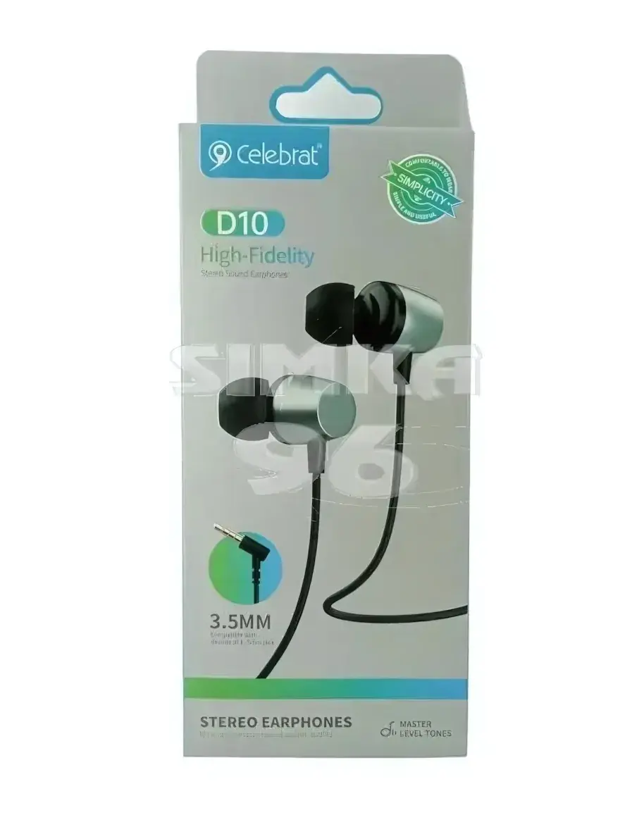 Наушники имеют округлую форму, что обеспечивает комфортное прилегание к ушам. Цвета наушников: один черный, другой серебристый, что добавляет им стильный вид. Упаковка выполнена в светлых тонах с акцентами синего и зеленого, что делает ее привлекательной. Celebrat D10 — это не просто наушники, это ваш надежный спутник в мире музыки.