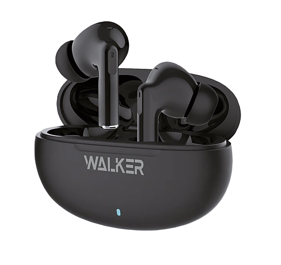 Чёрный матовый корпус с логотипом WALKER сочетает стиль и практичность. Зарядный кейс с магнитной фиксацией наушников предотвращает потерю. Время работы до 5 часов без подзарядки с возможностью 3 полных циклов заряда от кейса.