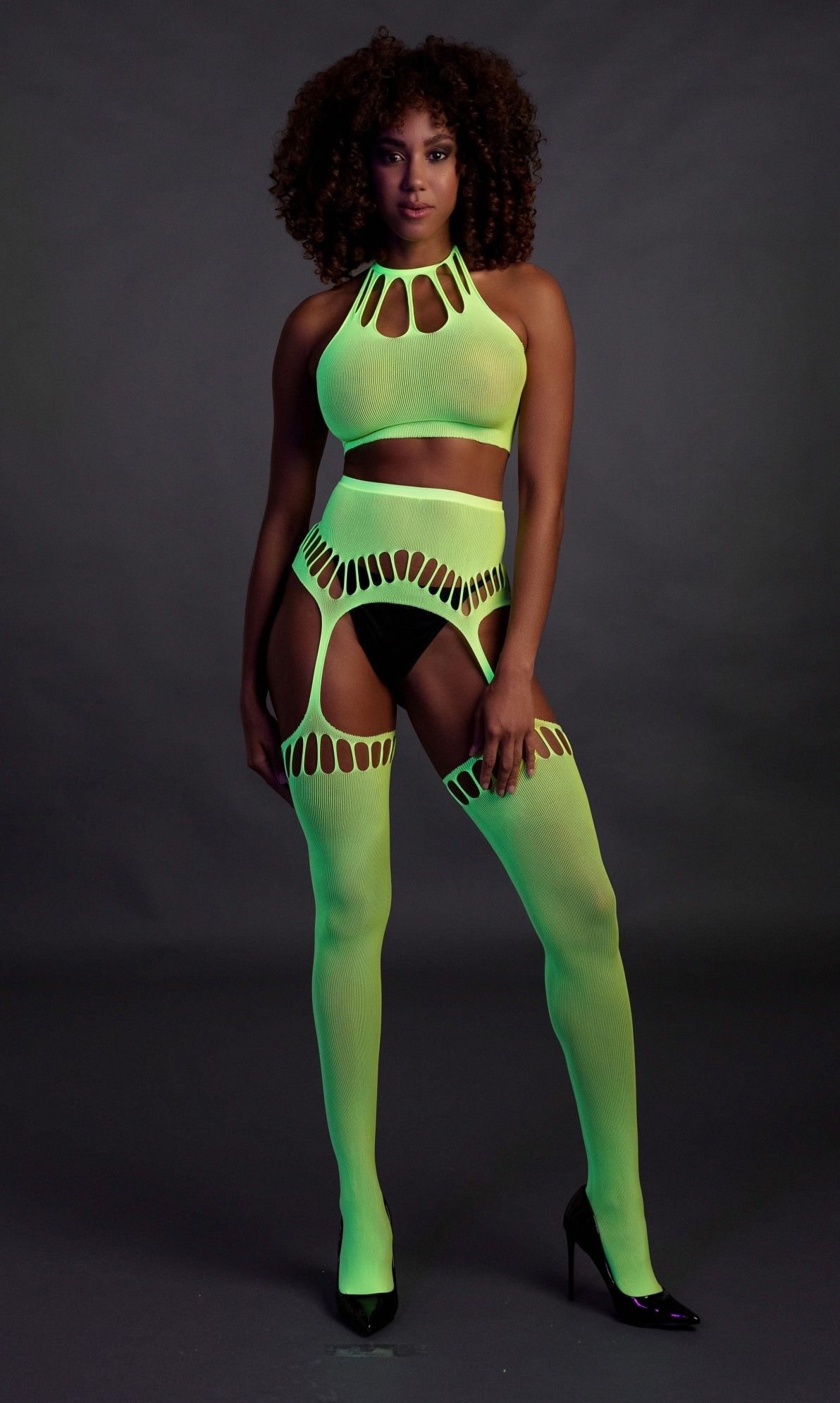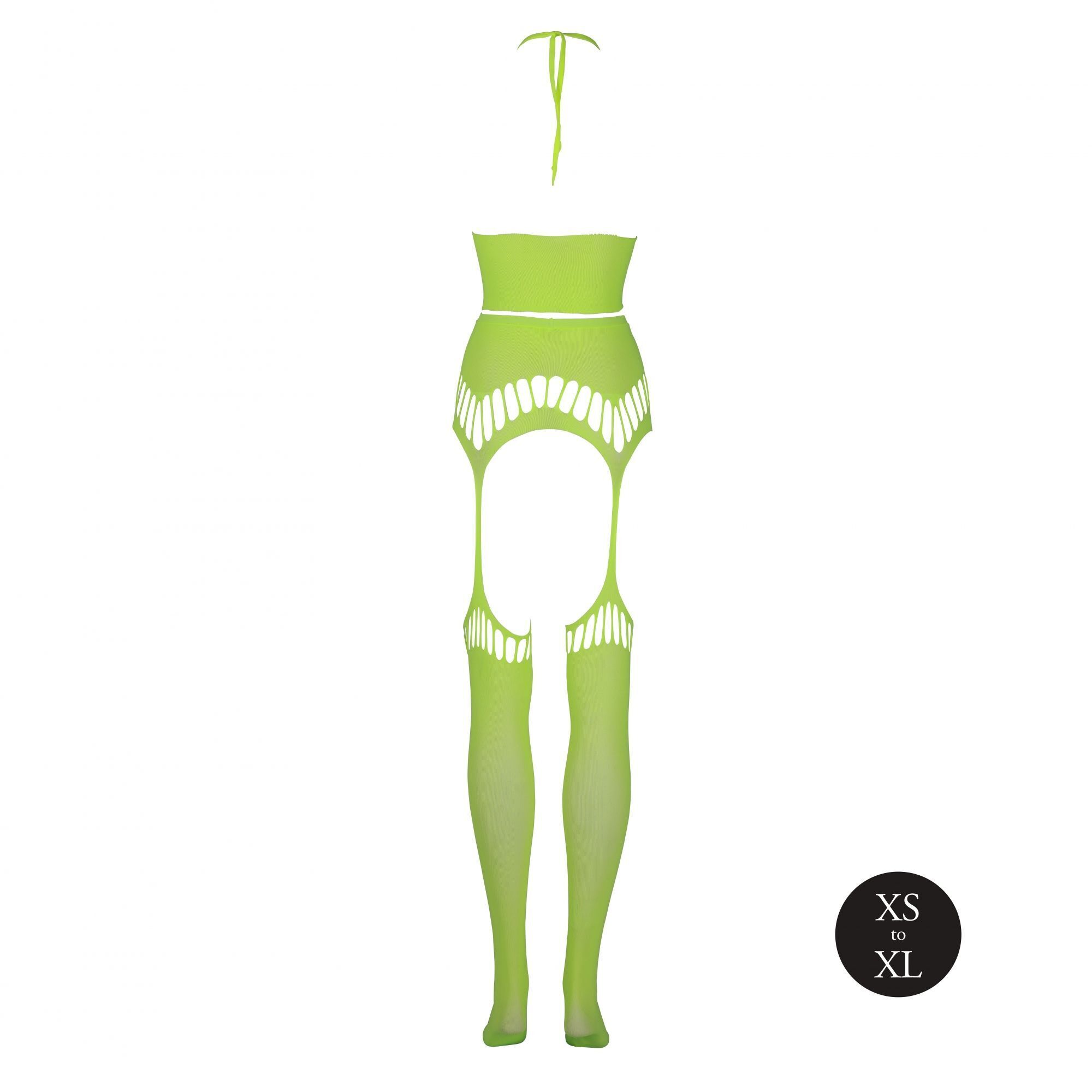 Комплект состоит из короткого топа и чулок с имитацией подвязок, что делает его идеальным для использования как в спальне, так и в качестве клубной одежды. Топ без бретелек с завязками на шее обеспечивает надежную поддержку, а чулки с высокой талией и вырезами подчеркивают ваши ноги и создают эффект открытых участков кожи. Этот комплект подходит для женщин всех размеров от XS до XL, что делает его универсальным выбором для любой фигуры.