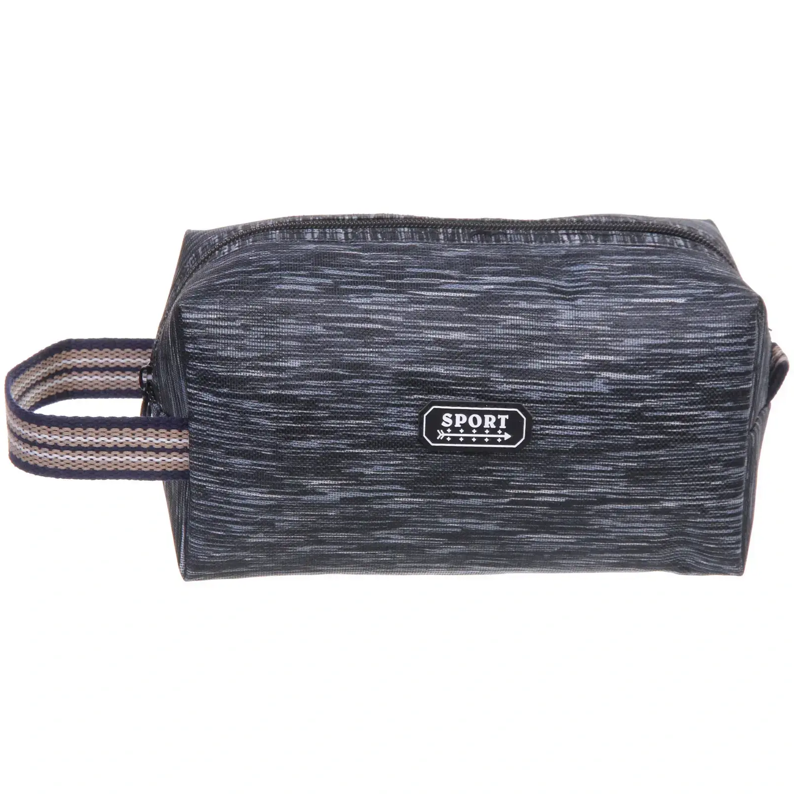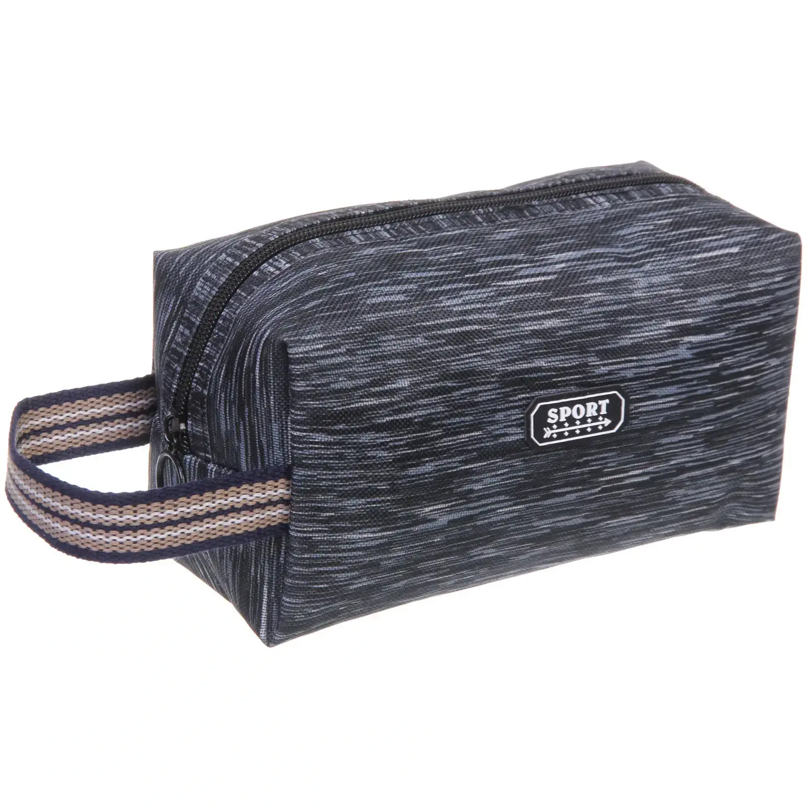 Несессер имеет прямоугольную форму с закругленными углами, что делает его удобным для хранения. Ручка выполнена из текстильного материала с полосатым дизайном, что добавляет оригинальности. На лицевой стороне расположена нашивка с надписью «SPORT», подчеркивающая спортивный стиль. Этот несессер станет отличным подарком для мужчин, которые ведут активный образ жизни и ценят удобство.