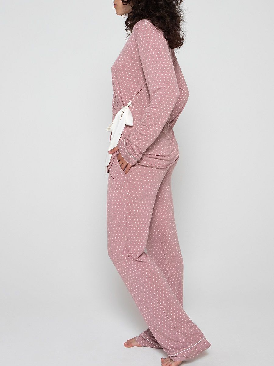 Пижама женская 'Opium' из вискозы, блуза с запахом и брюки на резинке, размер S, грязно-розовый с белым горошком