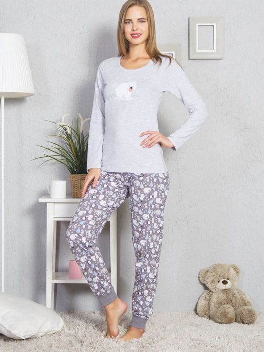 Почувствуйте уют и тепло в этой милой женской пижаме, созданной для идеального расслабления после долгого дня. Мягкий трикотаж из 100% хлопка нежно обнимает тело, обеспечивая комфортную температуру и свободу движений во время сна. Комплект из футболки с длинным рукавом и брюк на манжетах станет вашим любимым домашним нарядом.