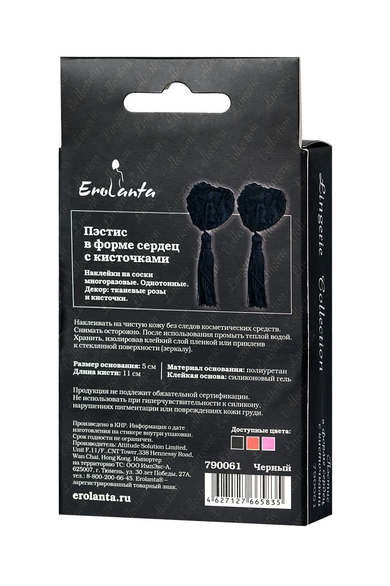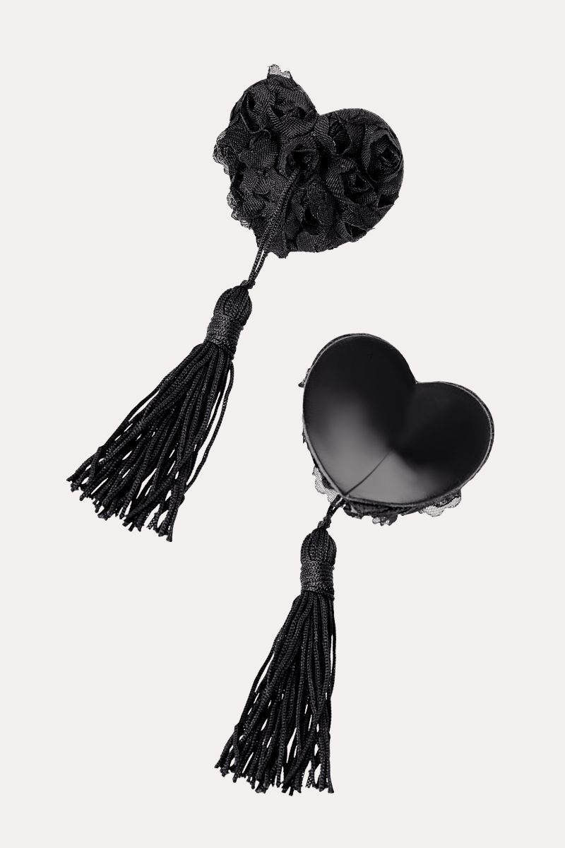 Черные пэстис с розами и кисточками станут идеальным аксессуаром для создания соблазнительного образа. Их элегантный дизайн сочетает в себе нежность тканевых роз и дерзкость длинных кистей.