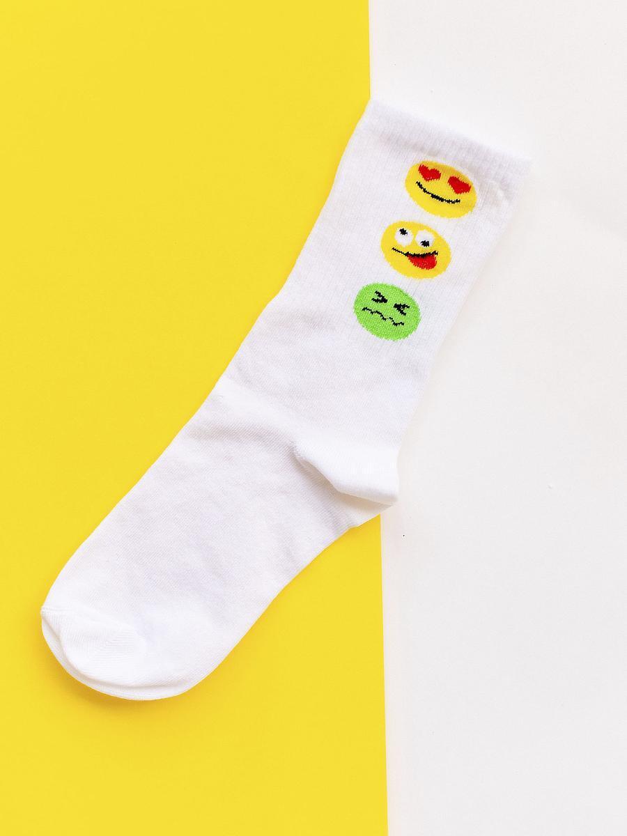 Вышивка отличается веселыми деталями: смайлик с сердечками вместо глаз, улыбающийся смайлик и забавный зелёный смайлик с недовольным выражением. Они придают носкам характер и яркость, оставаясь при этом гармоничными в сочетании с любой одеждой.