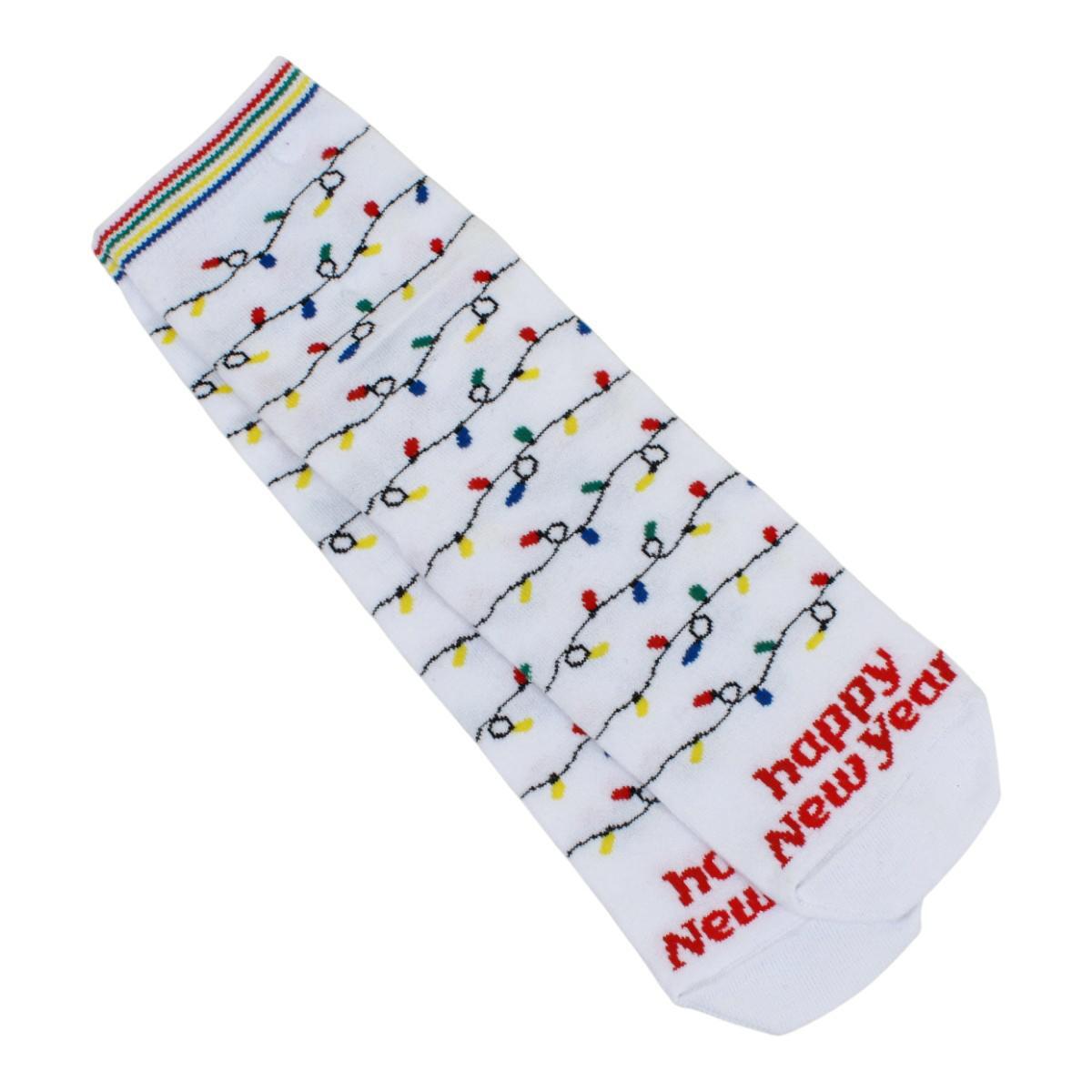 Подарите ребёнку тепло и уют даже в самые холодные зимние дни с этими мягкими и приятными на ощупь носками. Белая основа украшена ярким праздничным рисунком — гирлянды разноцветных огоньков и надпись "happy New Year" создают атмосферу настоящей зимней сказки.
