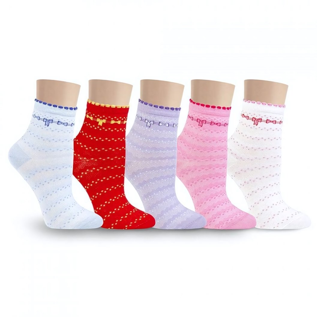 Эти носки созданы для повседневного комфорта и лёгкости движений. Мягкая хлопковая ткань бережно касается кожи, позволяя ногам чувствовать себя свободно в течение дня. Красочные узоры и элегантные бантики добавляют образу очарование и индивидуальность.