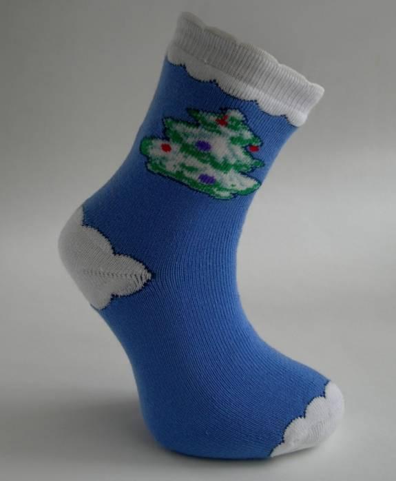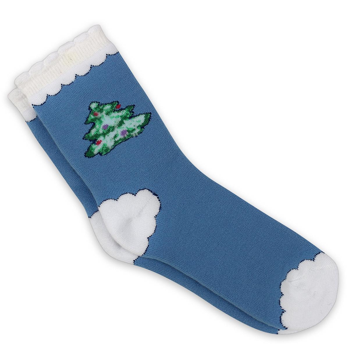 Размер 18 идеально подходит для детей младшего возраста. Цвет – бирюзовый с белыми облаками и яркой зеленой елью с декоративными шарами в красных и фиолетовых тонах. Отгружается один носок, страна производства – Россия. Материал – хлопок для максимального комфорта и воздухопроницаемости.