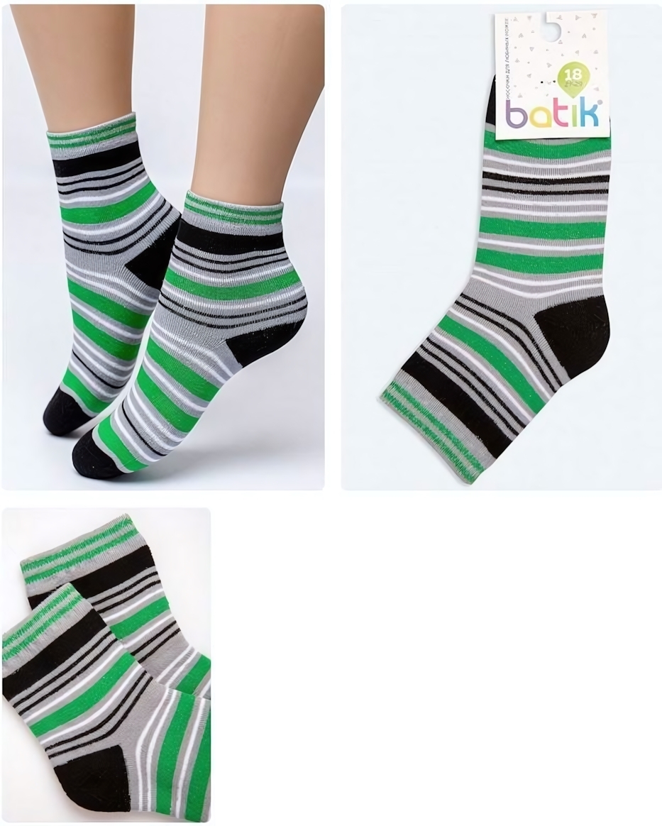 Материал — хлопок 80%, полиамид 15%, лайкра 5%. Цвет — серый с зелеными и черными полосами. Короткая длина до щиколотки. Разработаны специально для мальчиков, подойдут как для дома, так и для активного отдыха. Носки легко стираются, сохраняют форму и цвет даже после многократных стирок.