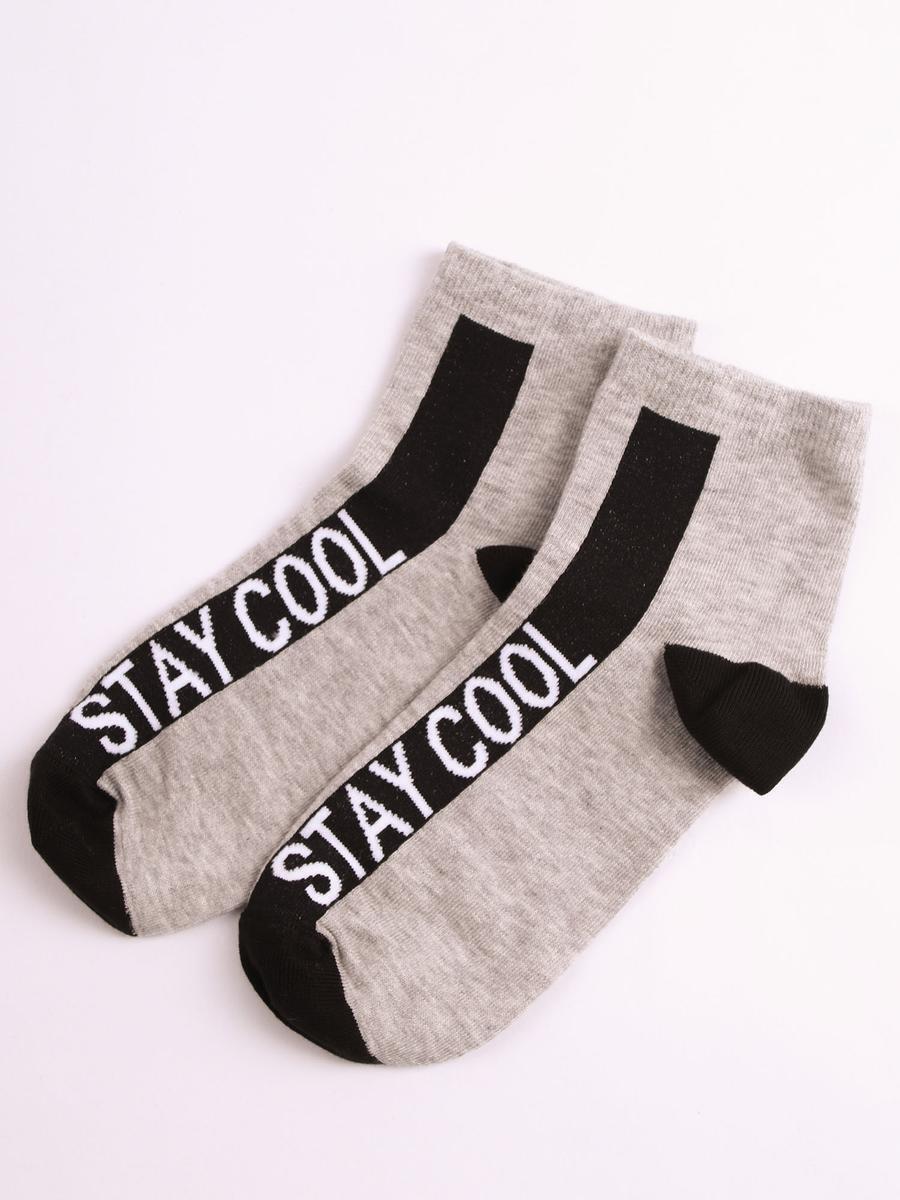 Эти носки созданы для тех, кто ценит удобство и аккуратный внешний вид в повседневной одежде. Мягкий серый меланж сочетается с черной подошвой и контрастной надписью "STAY COOL", которая добавляет изделию индивидуальности и современного стиля.