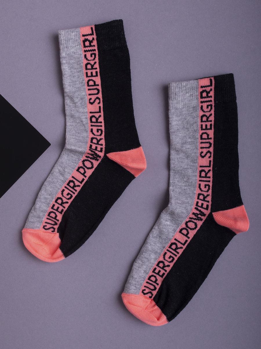Носки детские хлопковые серо-черные с розовыми вставками и двубортной резинкой, размер 20