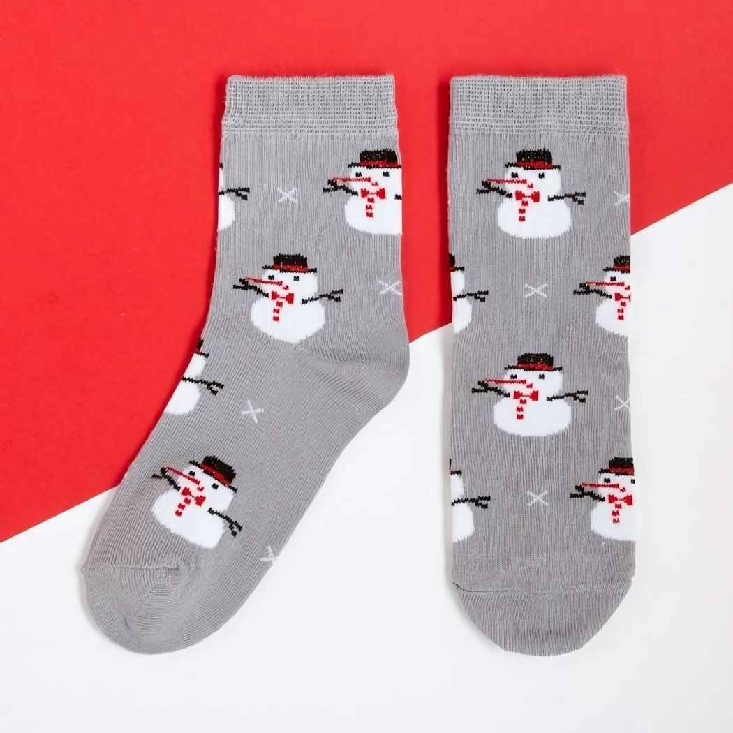 Размер – 18–20 см. Цвет – серый с рисунком снеговиков. Материал – трикотаж (хлопок, полиамид, эластан). Отгружается одна пара носков.