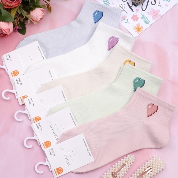 Носки выполнены из высококачественного хлопка с добавлением синтетических волокон, что обеспечивает отличную посадку по ноге и долговечность изделия. Они подходят для носки с различной обувью, включая кроссовки и балетки, что делает их универсальным выбором для любого случая. Носки представлены в шести пастельных цветах: светло-серый, белый, светло-розовый, зеленый, светло-персиковый и розовый, что позволяет легко сочетать их с вашим гардеробом.