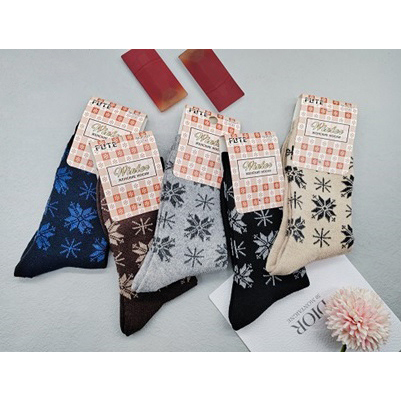 Носки представлены в четырех цветах: темно-синие, коричневые, серые и бежевые. Каждый цвет имеет уникальный узор снежинок, что делает их универсальными для любого гардероба. Стандартная длина носков достигает голеней, что обеспечивает дополнительное тепло и комфорт.