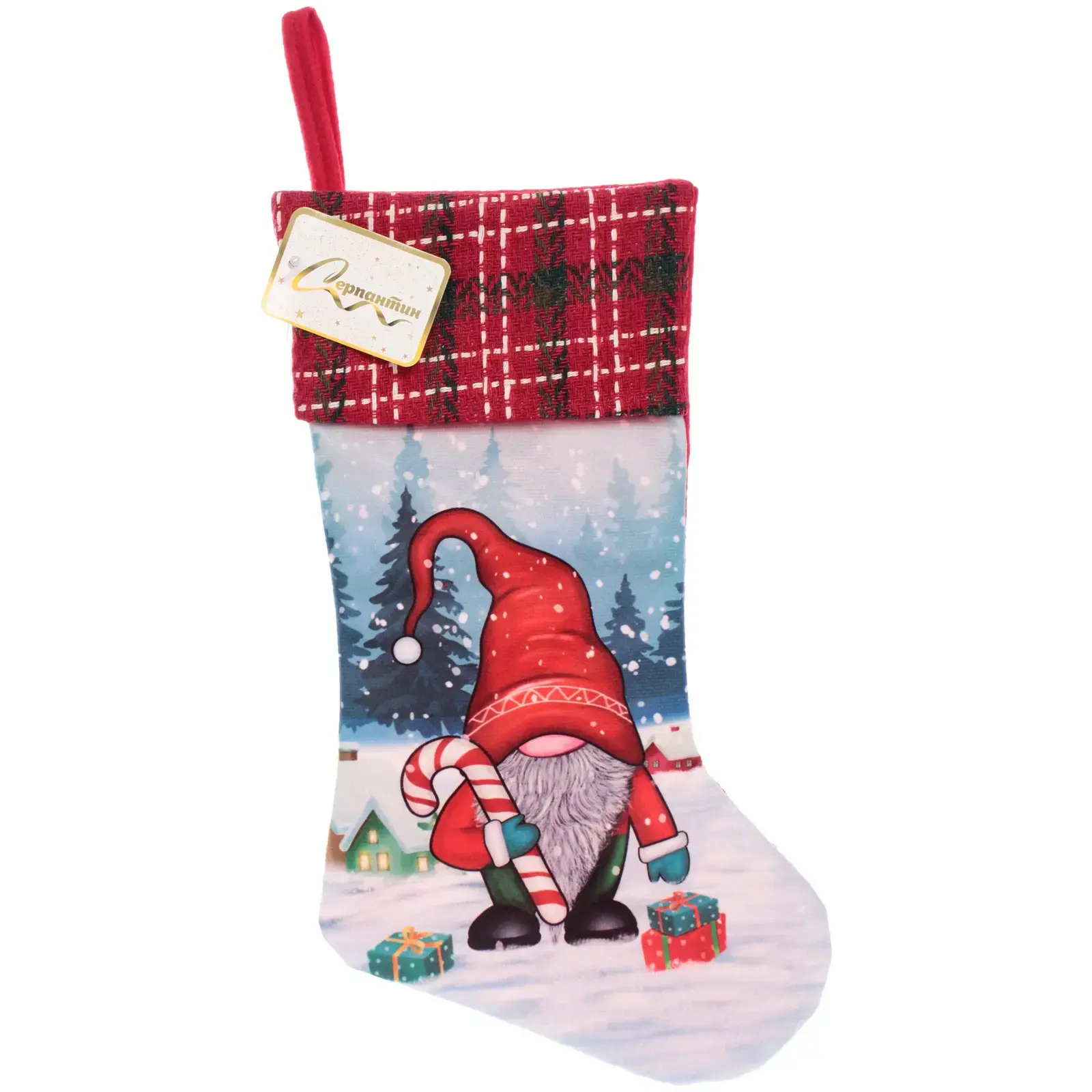 Носок выполнен из текстильного материала, что делает его мягким и приятным на ощупь. Красный верх с клетчатым узором и зимний пейзаж с домиками и деревьями создают уютную атмосферу. Не упустите возможность добавить этот замечательный носок в вашу коллекцию новогодних украшений!
