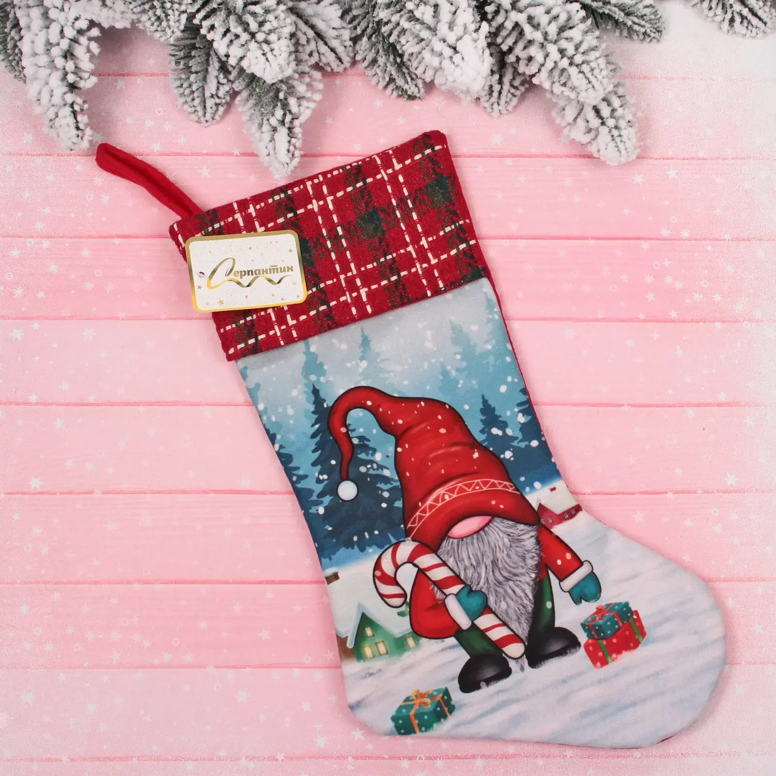Создайте атмосферу праздника с нашим новогодним носком «Лесовичок с леденцом». Этот яркий и красочный чулок станет отличным дополнением к вашему новогоднему декору и подарит радость как детям, так и взрослым. Его уникальный дизайн с изображением гномика, который держит сладкую палочку, добавит волшебства в ваш дом.