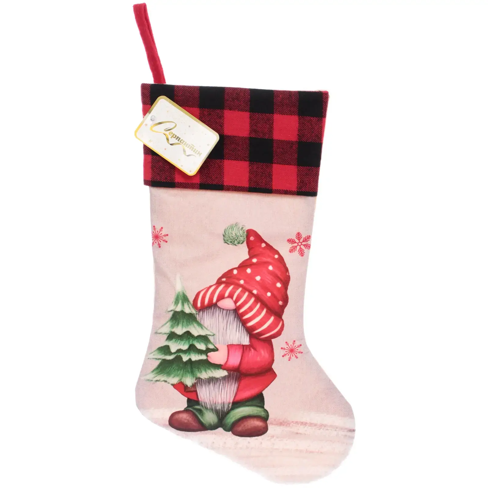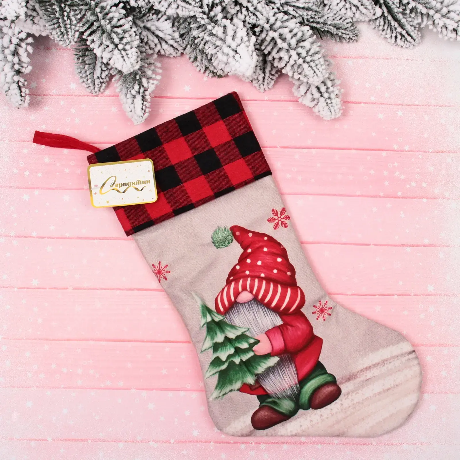 Носок имеет верхнюю часть в клетку черного и красного цветов, а основная часть выполнена в светлых тонах с принтом. Декоративные элементы, такие как снежинки и гном, добавляют ему уникальности и привлекательности. Не упустите возможность сделать ваш Новый год особенным с носком «Лесовик с ёлкой»!