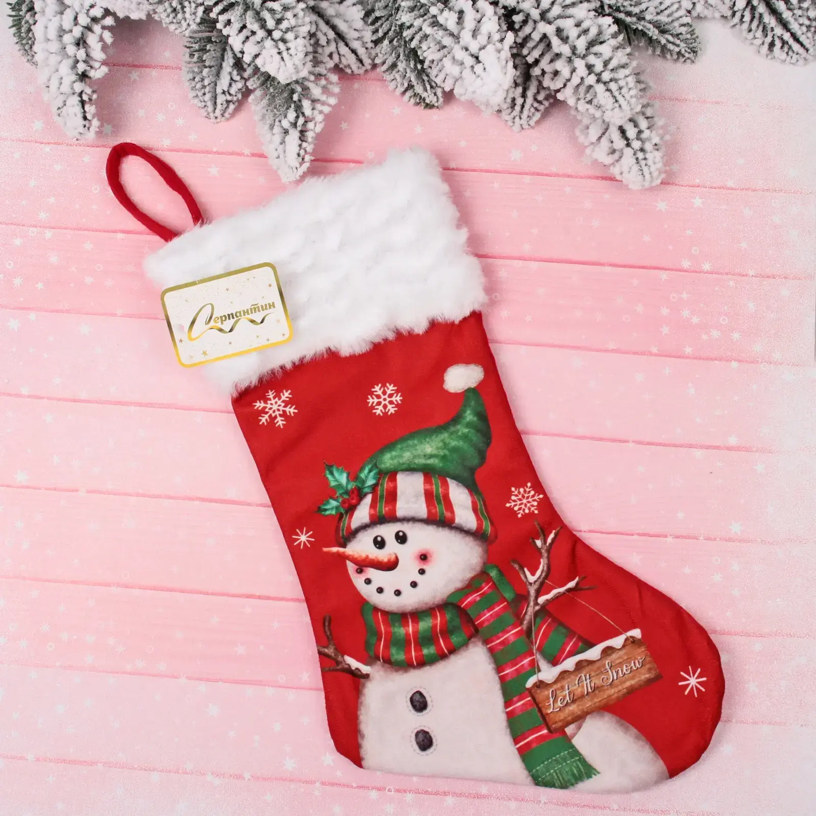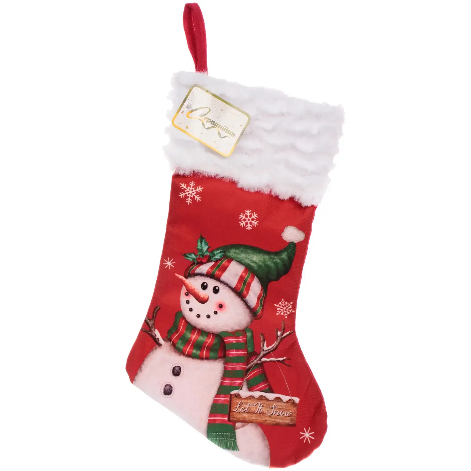 Выбирая носок «Снеговик», вы получаете не только красивый, но и практичный аксессуар. Яркий красный цвет и изображение снеговика с зеленой шапкой и полосатым шарфом создают веселое настроение. Носок также украшен надписью «Let It Snow», что добавляет ему особый шарм. Мягкий флис в верхней части чулка придает ему уютный вид и делает его безопасным для детей.