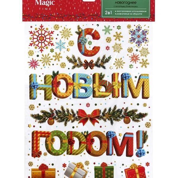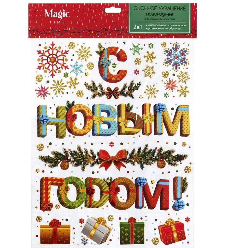Цвета букв включают красный, зеленый, синий и золотистый, что делает украшение универсальным для любого стиля интерьера. Наклейка легко комбинируется с другими новогодними декорами, создавая гармоничный и стильный вид. Размеры конкретно не указаны, но надпись 'С НОВЫМ ГОДОМ!' отлично впишется в любое окно, добавляя яркий акцент к вашему новогоднему оформлению.