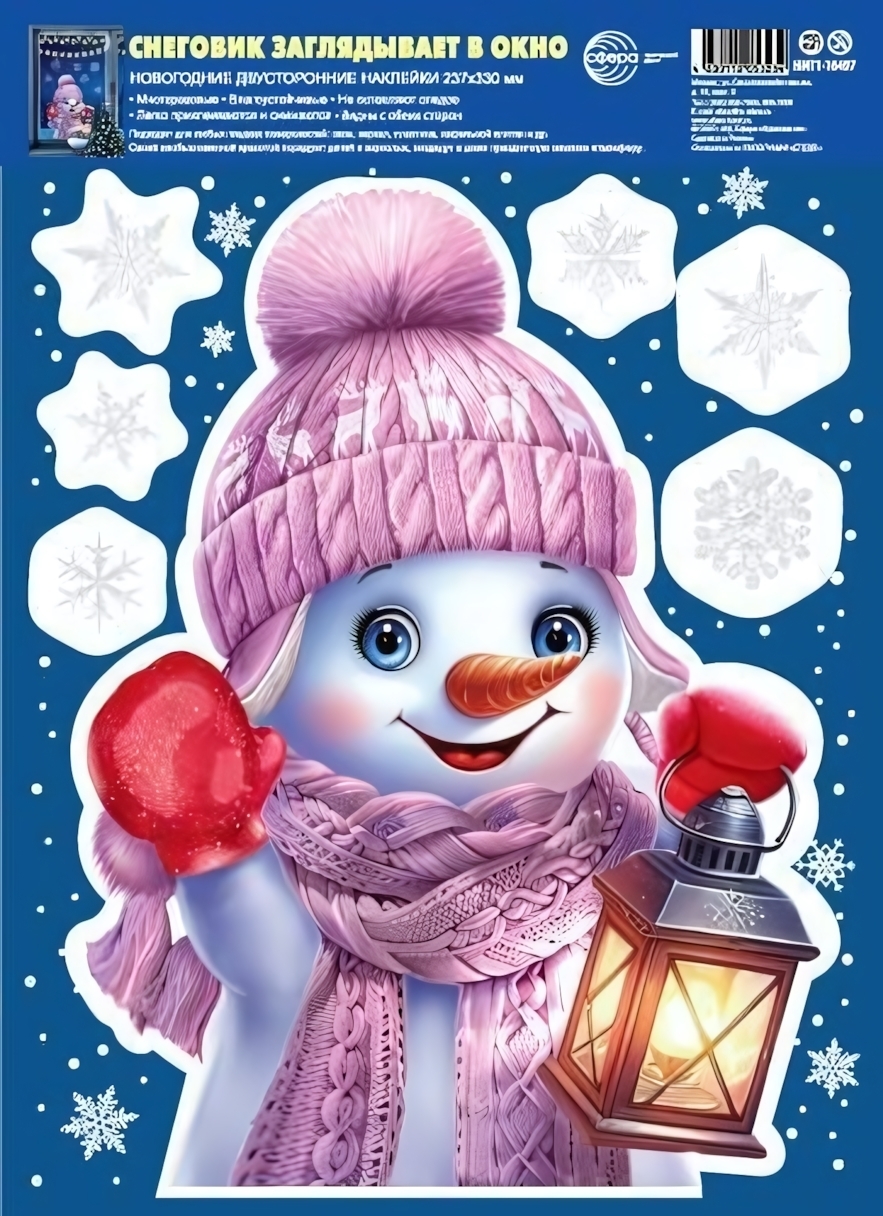 Если вы хотите наполнить дом уютной зимней атмосферой, эта двухсторонняя наклейка А4+ со снеговиком станет отличным выбором. Яркий дизайн с милым снеговиком в розовой шапке и шарфе, держащим фонарь, мгновенно превратит любое окно в сказочный зимний пейзаж, который будет радовать и взрослых, и детей.