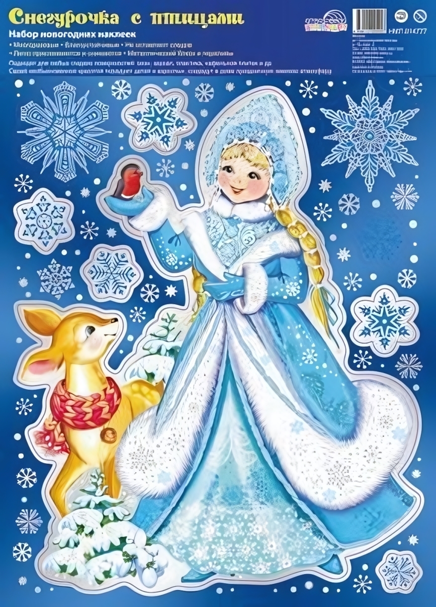 Новогодние наклейки на окно А4+ «снегурочка с олененком», серебряный металл, многоцветные, 330×237 мм, легко снимаются