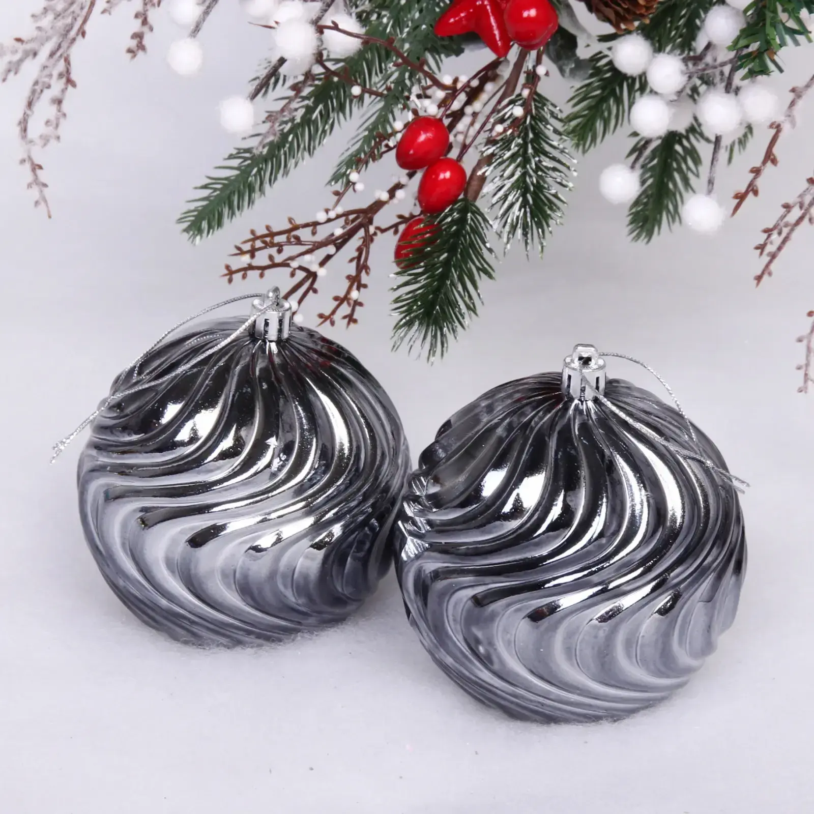 Набор из двух эффектных шаров с волнообразным рельефом создаст праздничную атмосферу без хлопот. Графитовый оттенок с металлическим блеском гармонично впишется как в строгий офисный интерьер, так и в домашнее убранство.
