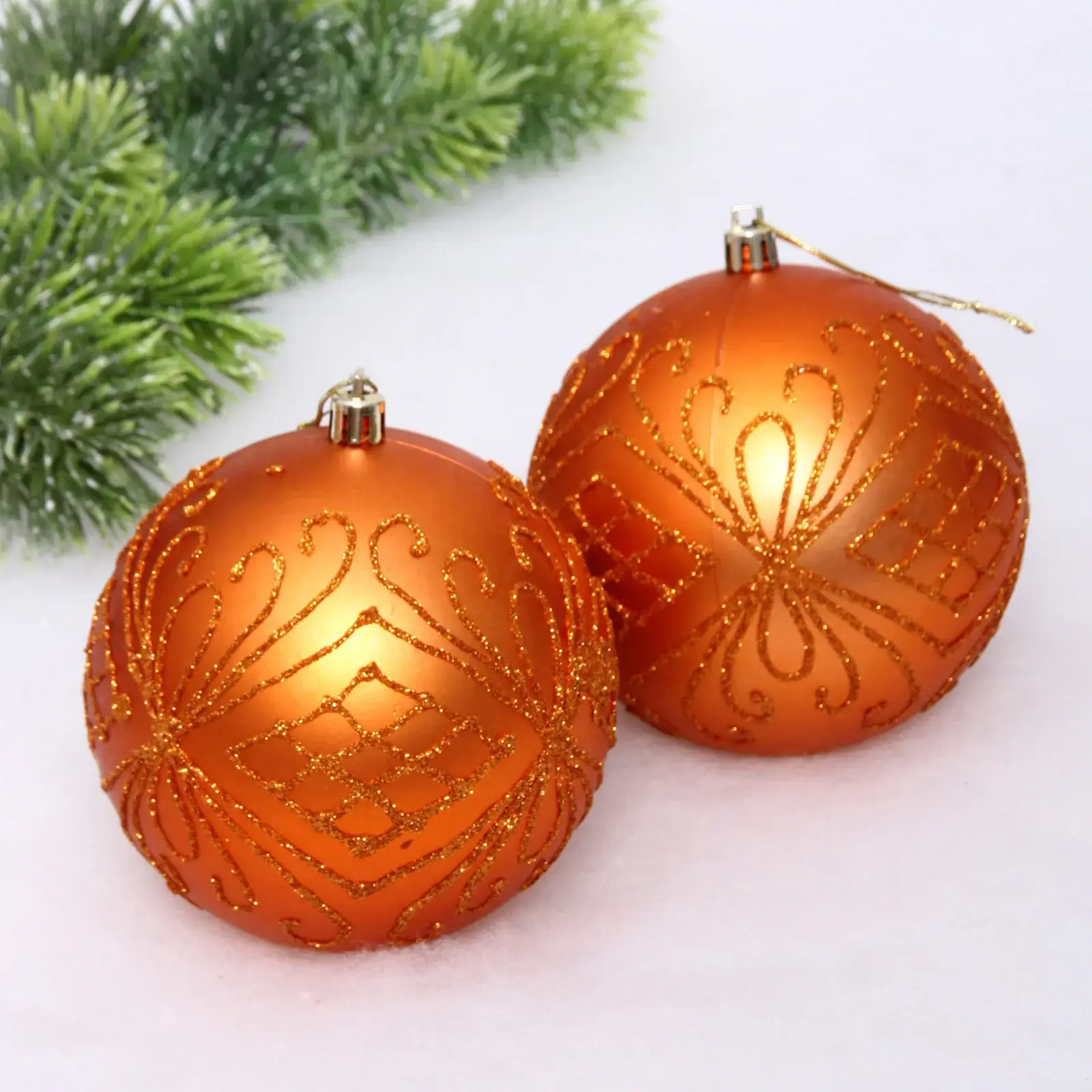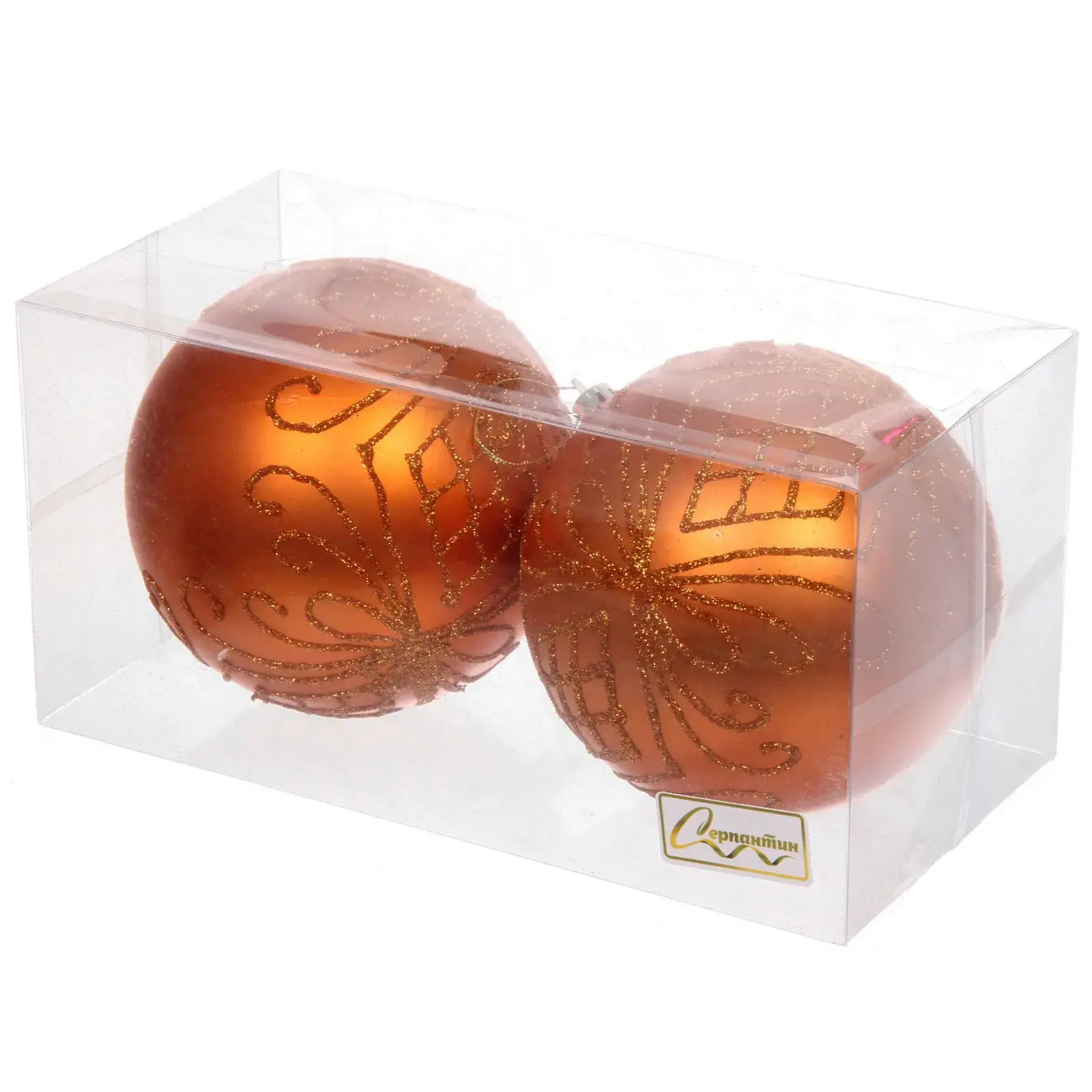 В набор входят два шара, каждый из которых имеет диаметр 10 см. Оранжевый цвет с золотистыми узорами делает их универсальными для любого новогоднего оформления. Упакованы шары в прозрачную пластиковую коробку, что позволяет удобно хранить их после праздников.