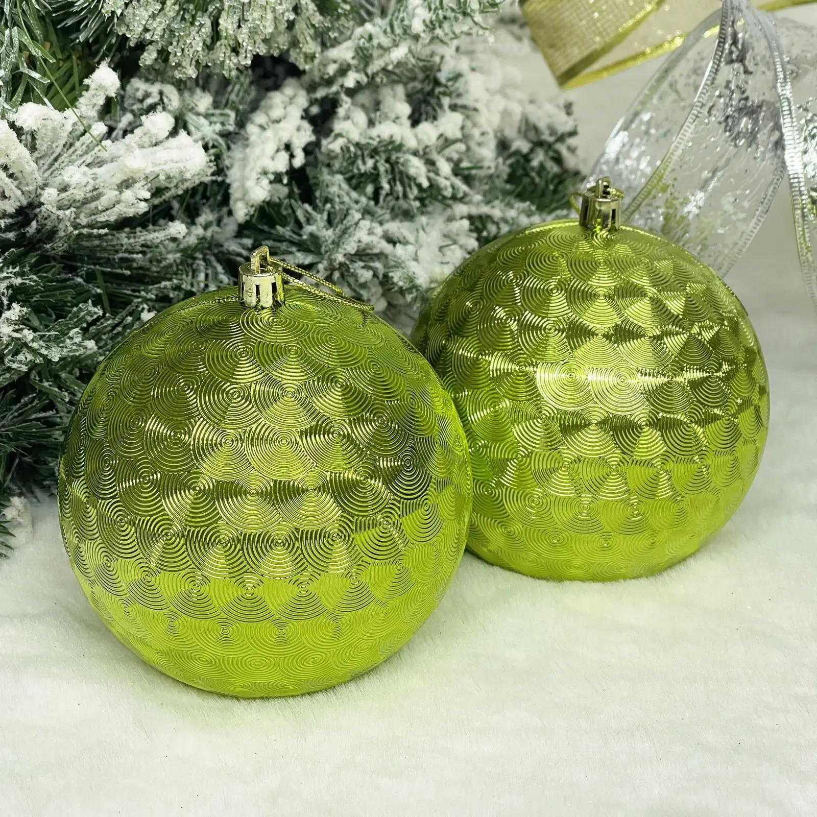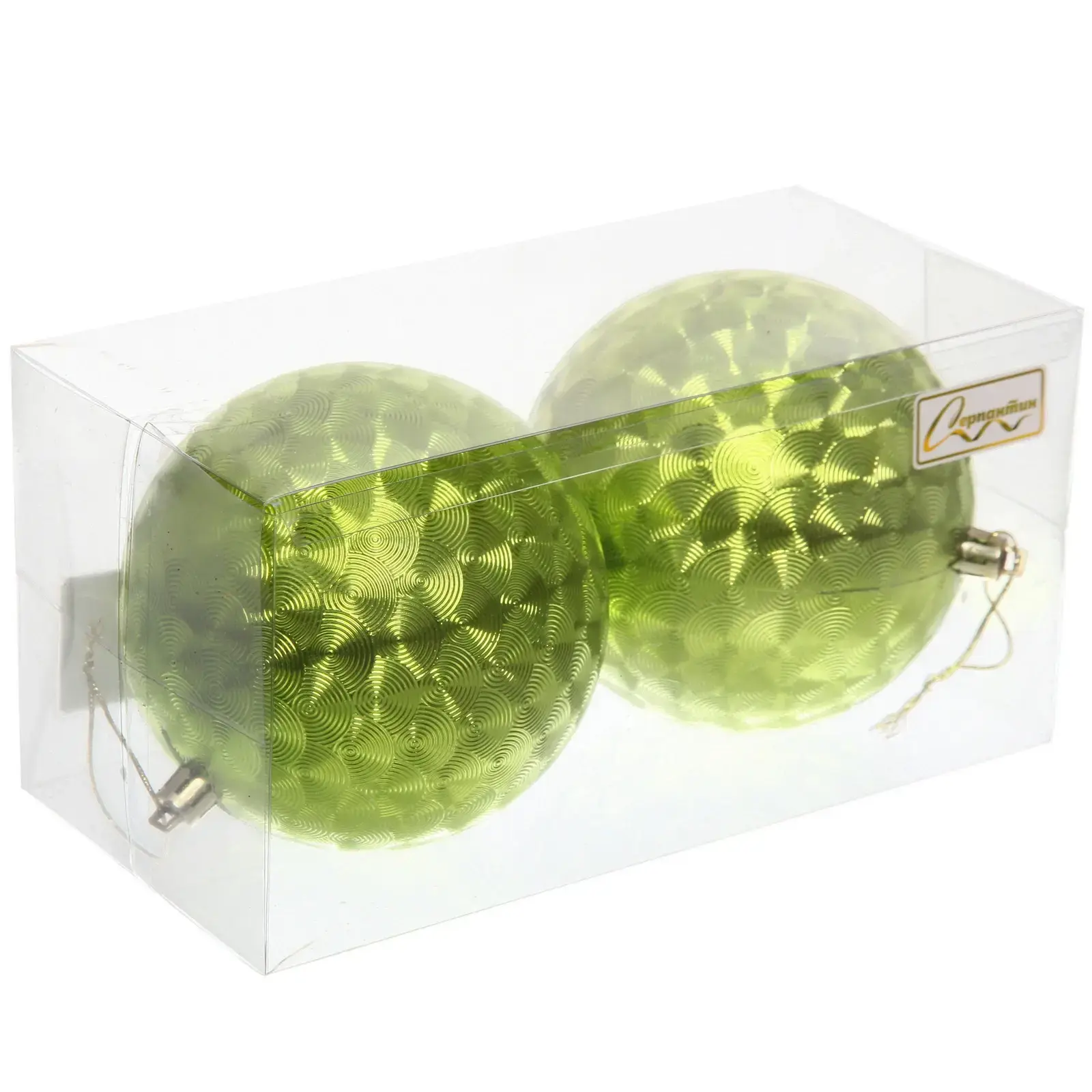 Диаметр каждого шара — 10 см, материал — пенопласт, цвет — салатовый с золотисто-зелёным отливом. В комплекте — два шара, упакованные в прозрачную прямоугольную коробку, позволяющую видеть декоративную поверхность ещё до распаковки. Идеально подходит для декора новогодней ели, праздничных композиций, оформления витрин или подарков.