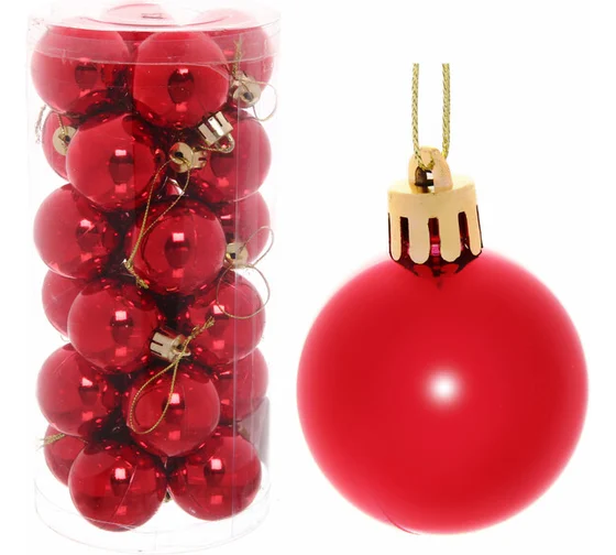 Каждый шар выполнен из прочного пластика, покрытого глянцевой лакированной пленкой. Цвет – ярко‑красный, с золотистыми элементами для удобного подвешивания. Диаметр 4 см, количество в наборе 24 штуки. Благодаря своей структуре шары легко моются и могут использоваться в последующие годы.