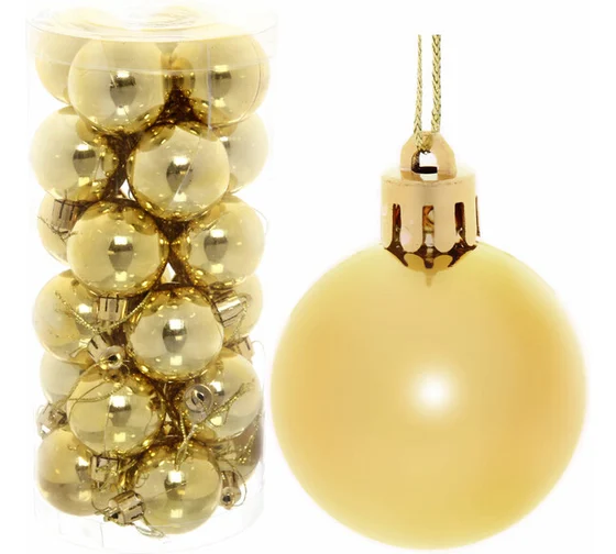 Набор состоит из 24 шаров диаметром 4 см. Классический золотой цвет делает их универсальным решением для создания праздничного интерьера.