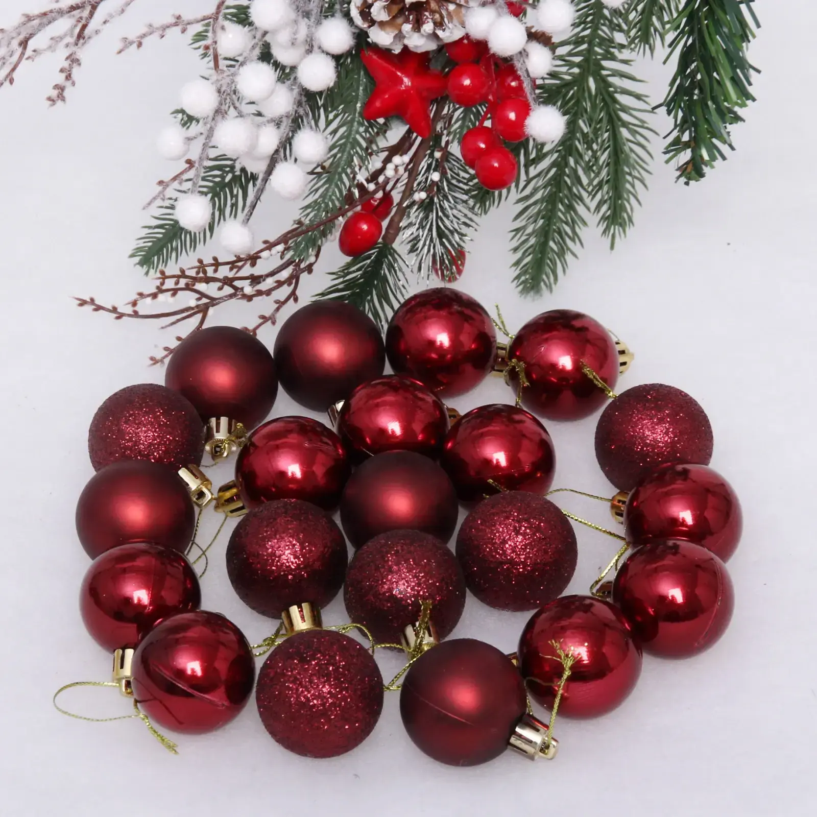 Новогодние шары — это не просто украшения, это символы праздника, которые наполняют дом атмосферой уюта и радости. Набор из 24 шаров в темном рубине с различными текстурами станет идеальным дополнением к вашей новогодней елке. Эти шары не только красивы, но и практичны: они легко подвешиваются благодаря золотым петелькам, а их разнообразие позволяет создавать уникальные композиции.