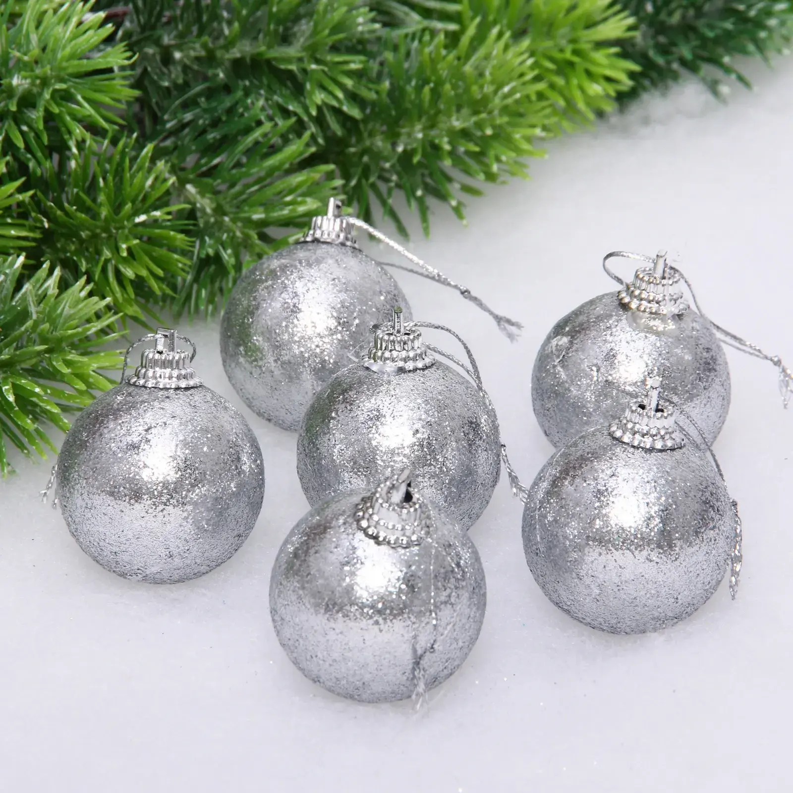 Набор из 6 серебристых шаров с голографическим напылением превратит вашу ёлку в сияющий арт-объект. Каждое украшение отражает свет тысячами разноцветных блесток, создавая эффект зимней сказки даже в самом строгом интерьере.