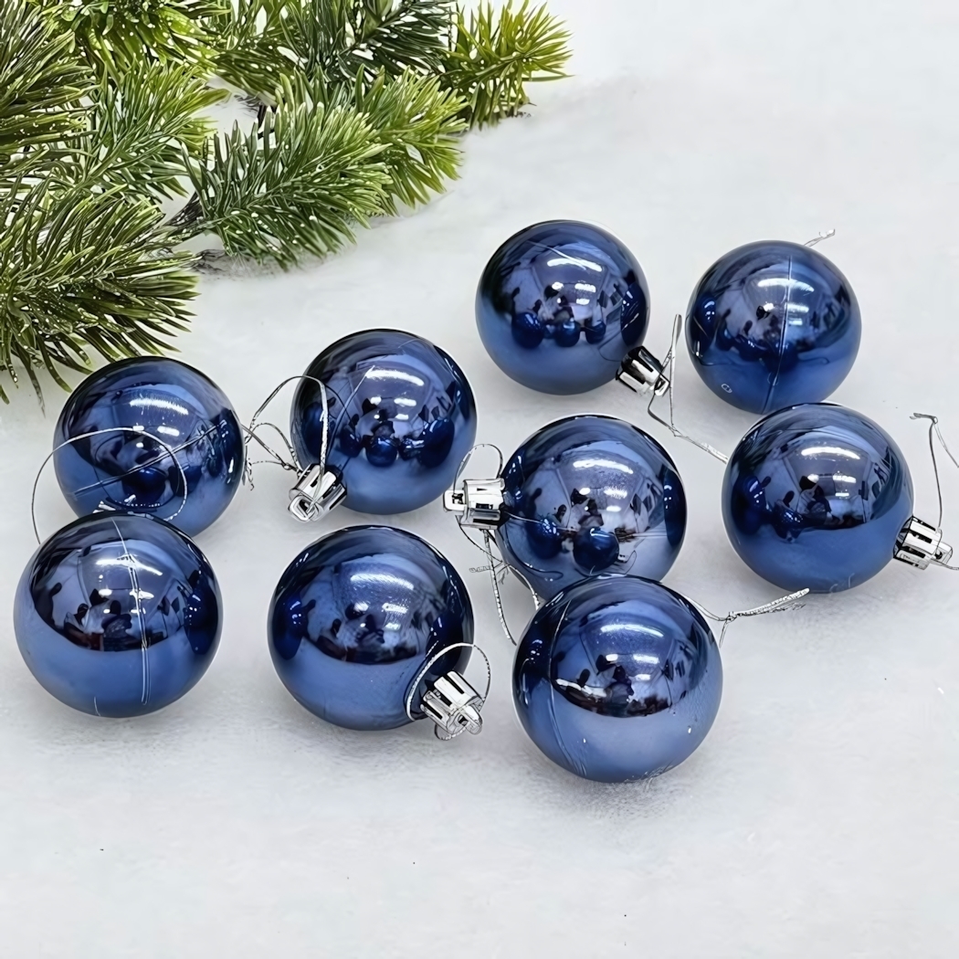 Диаметр каждого шара составляет 5 см — оптимальный размер для равномерного распределения по ветвям. Благодаря лёгкому весу украшения не перегружают ветки, а глянцевое покрытие защищает от выцветания. Идеально сочетаются с золотыми, серебристыми и белыми игрушками, а также гирляндами тёплого света.