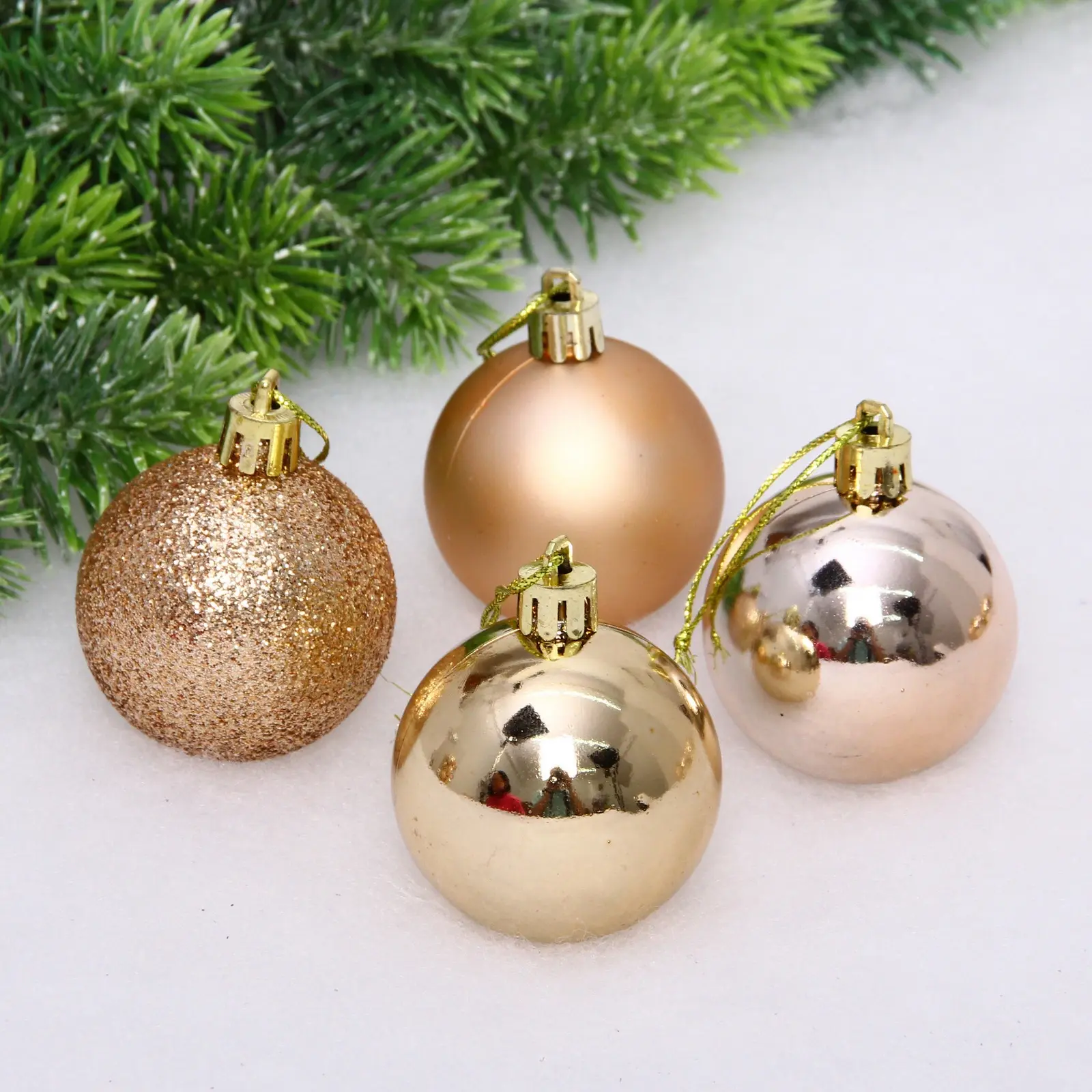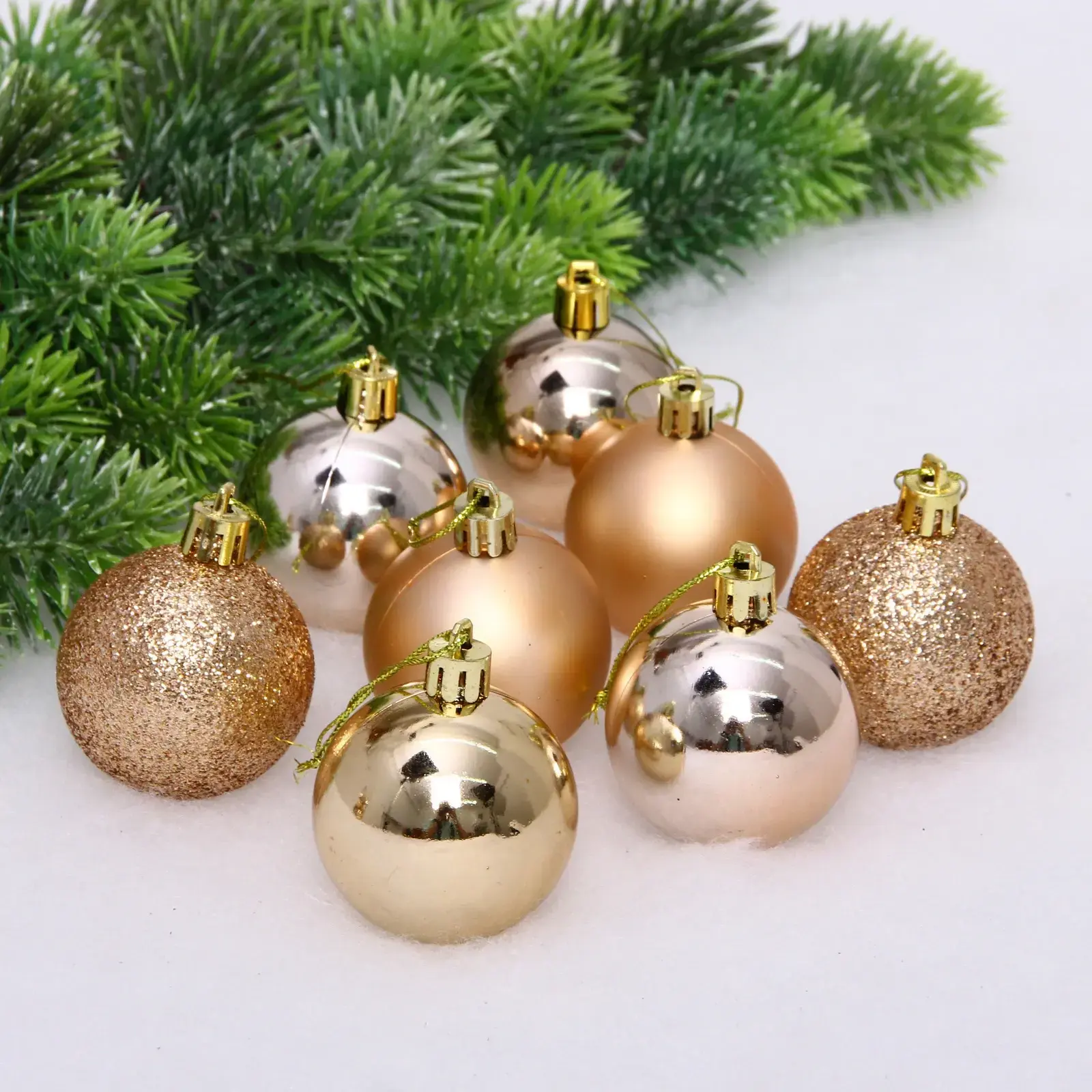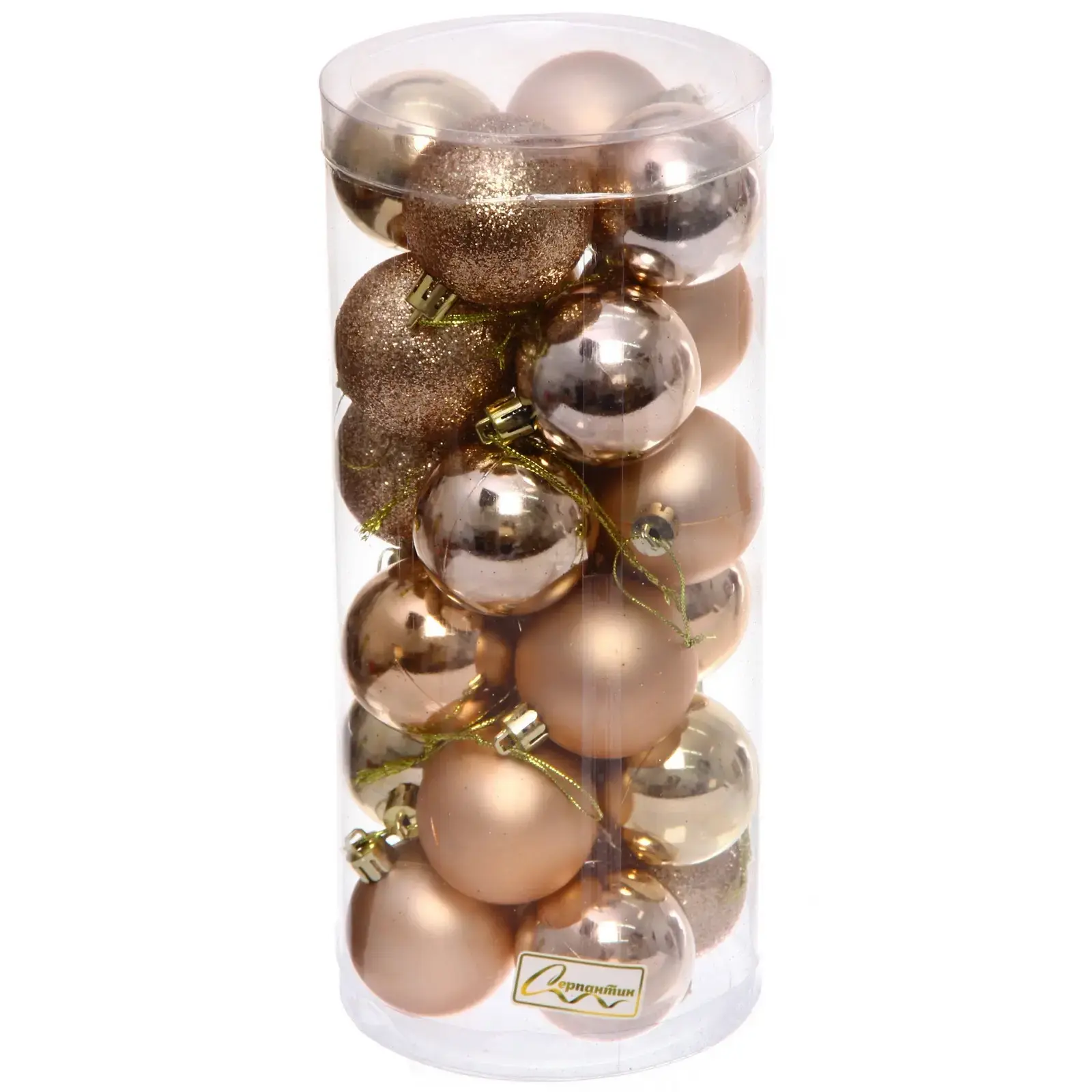 Шары выполнены из прочного пластика, что обеспечивает их долговечность и устойчивость к повреждениям. Размер каждого шара составляет 5 см, что делает их идеальными для украшения как больших, так и маленьких елок. Цветовая гамма включает теплые оттенки шампани, которые прекрасно сочетаются с другими новогодними украшениями.