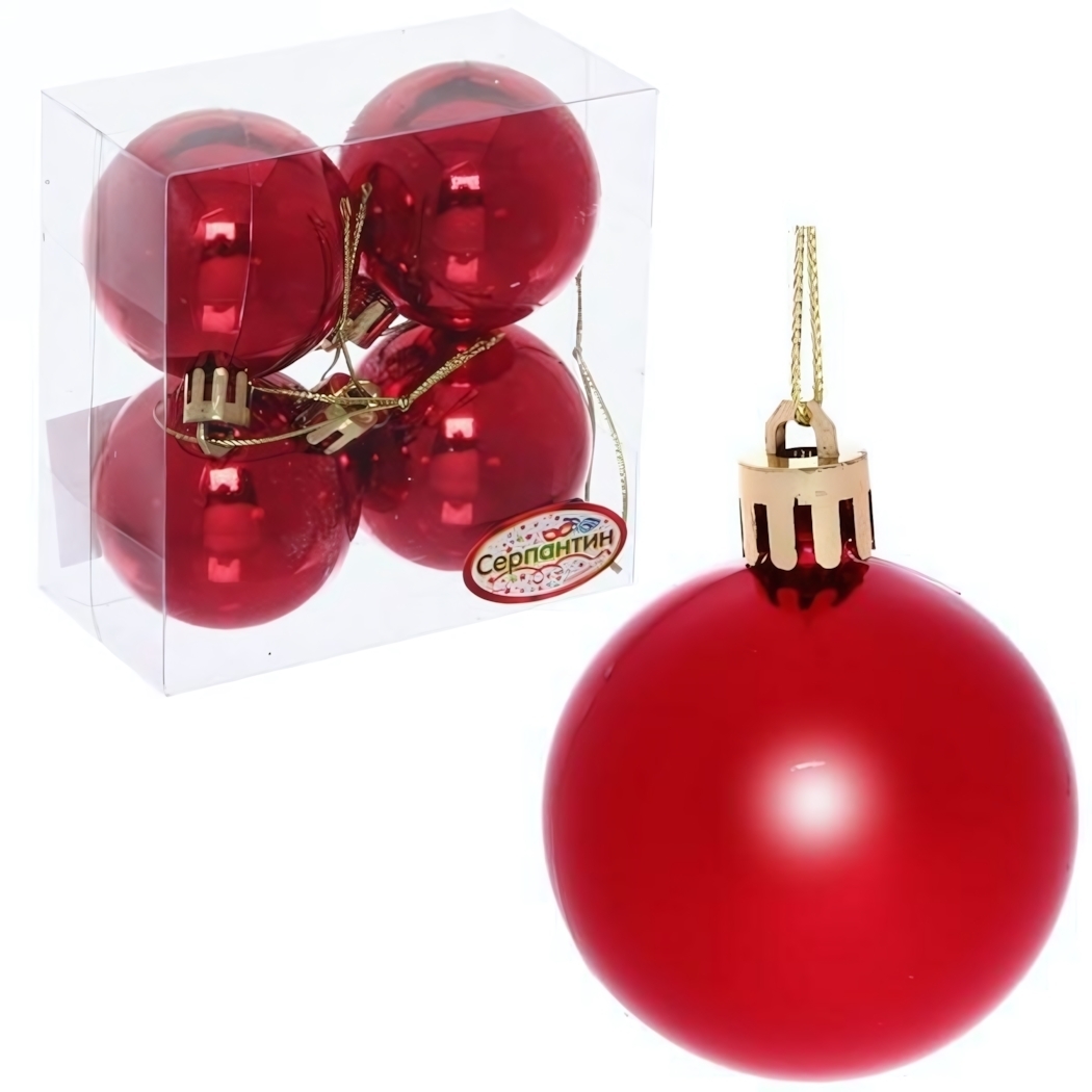 Шары изготавливаются из прочного пластика с глянцевым покрытием, что гарантирует их долговечность. Компактная упаковка защищает украшения при хранении. Набор из четырех штук позволяет создать гармоничный декор без дополнительных затрат времени на поиск подходящих украшений.