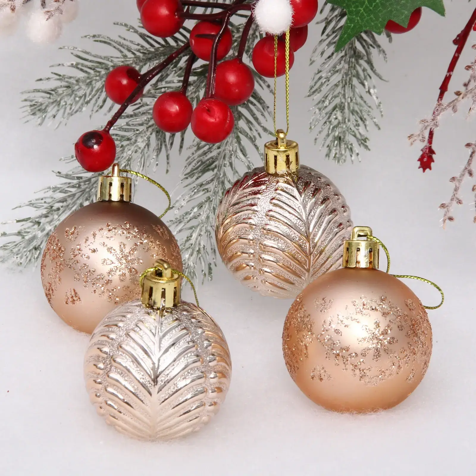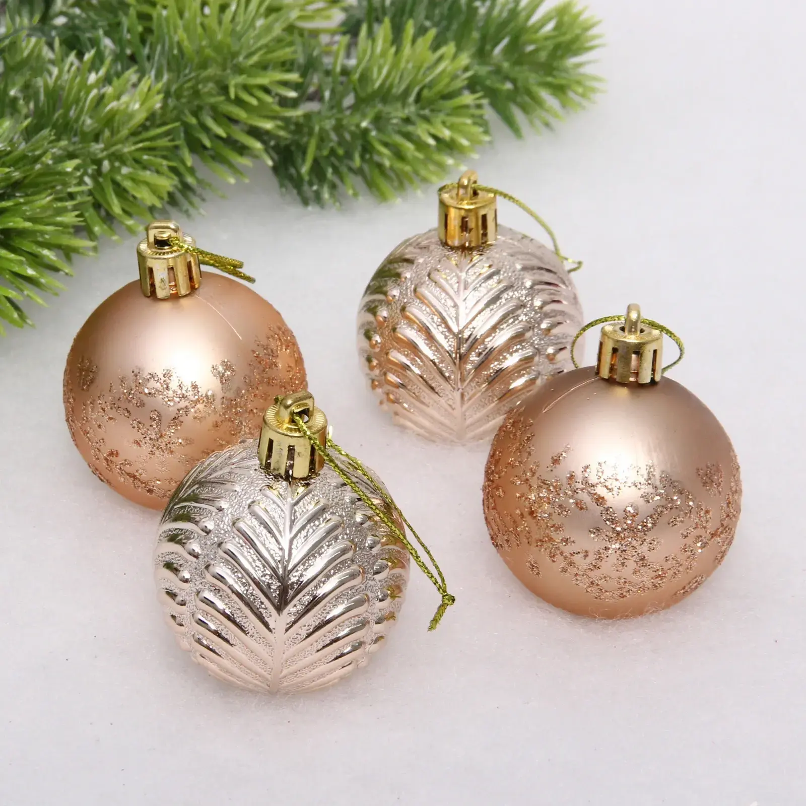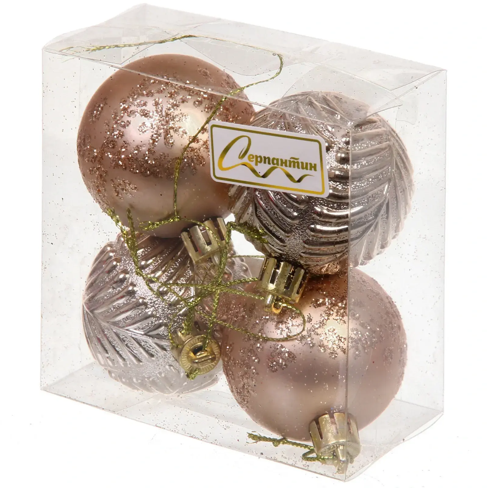 В наборе представлены четыре уникальных дизайна: матовые и глянцевые поверхности с различными текстурами - от рельефных узоров до мерцающих блесток. Каждый шар оснащен удобной петелькой для подвешивания.
