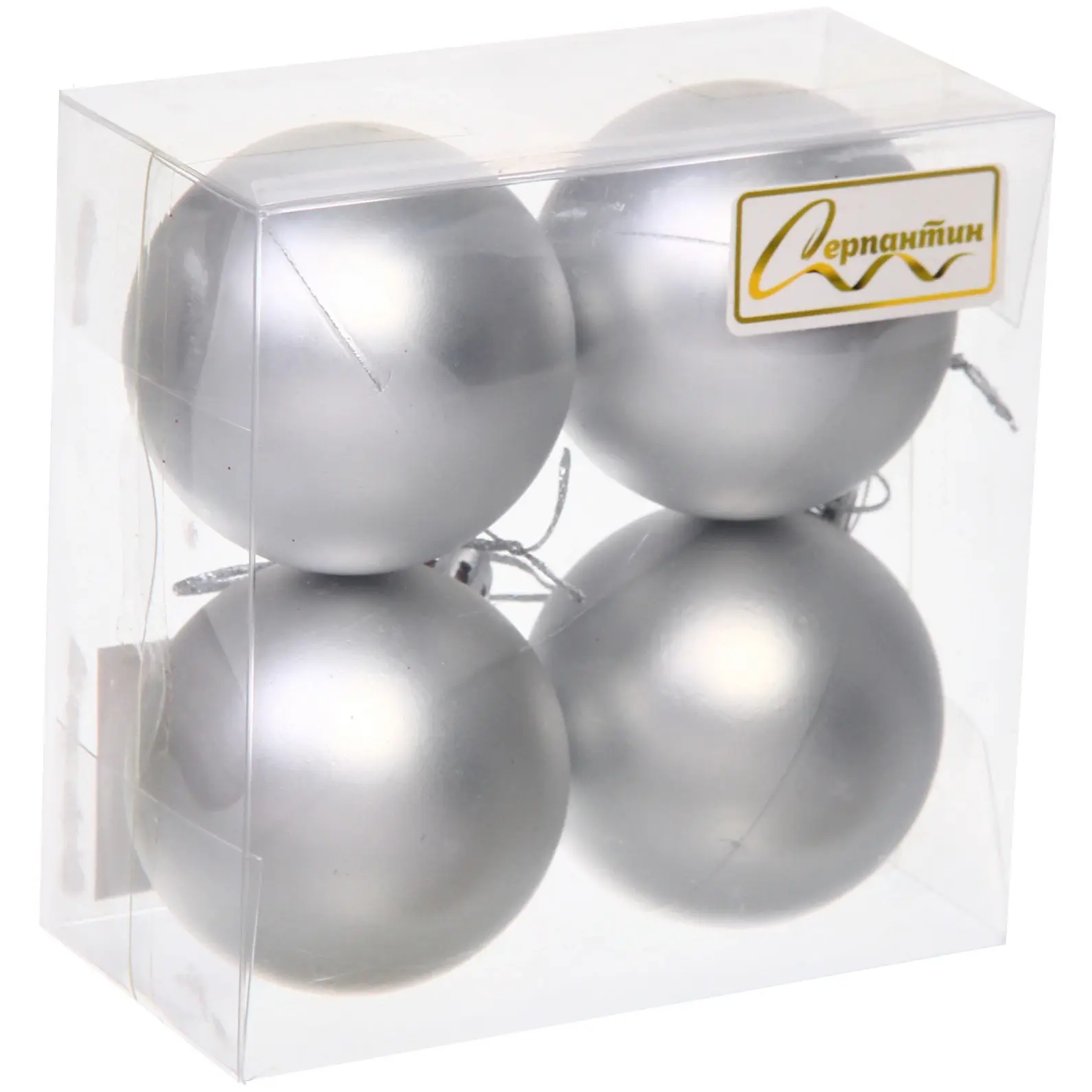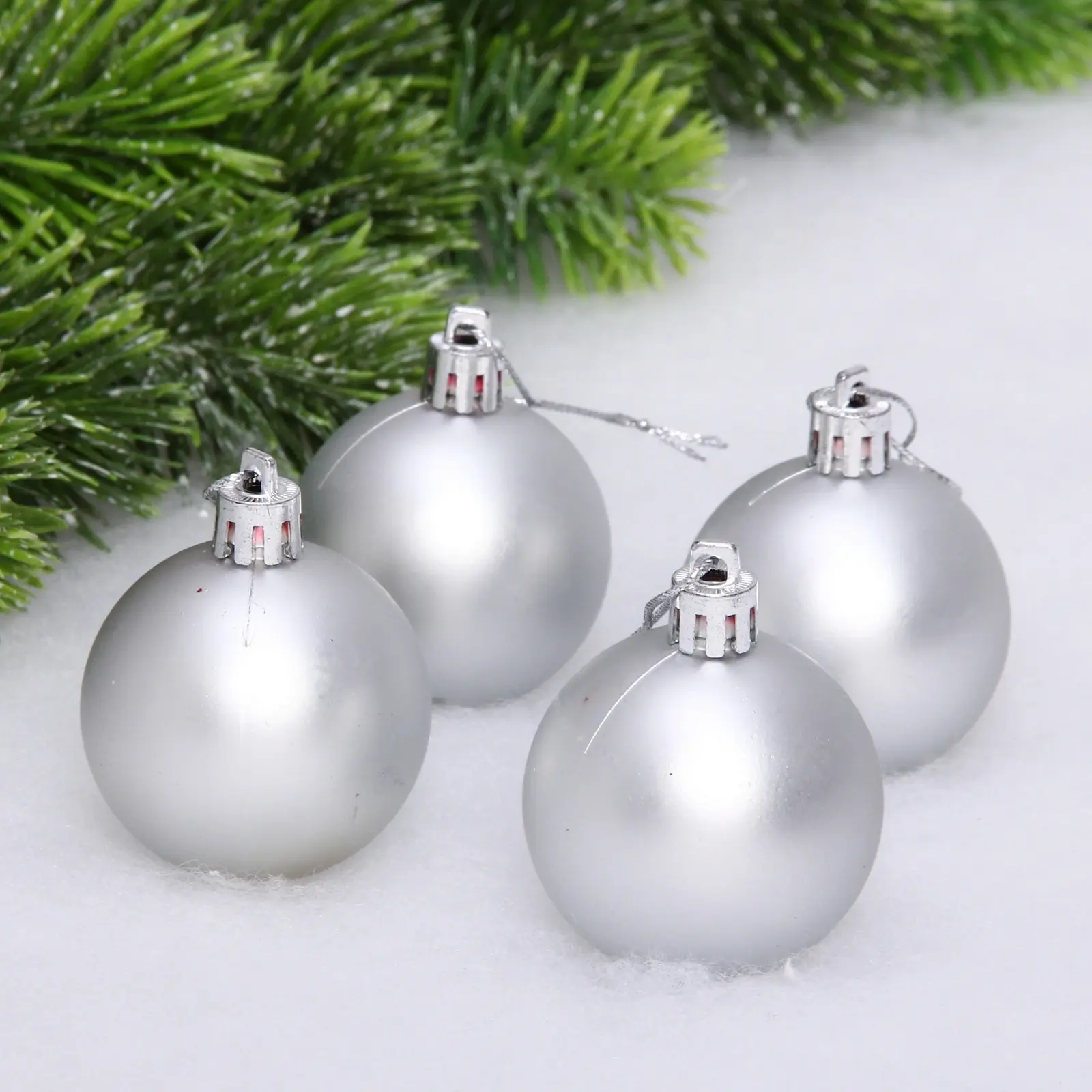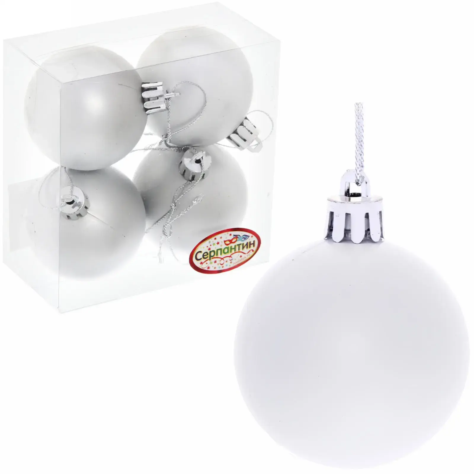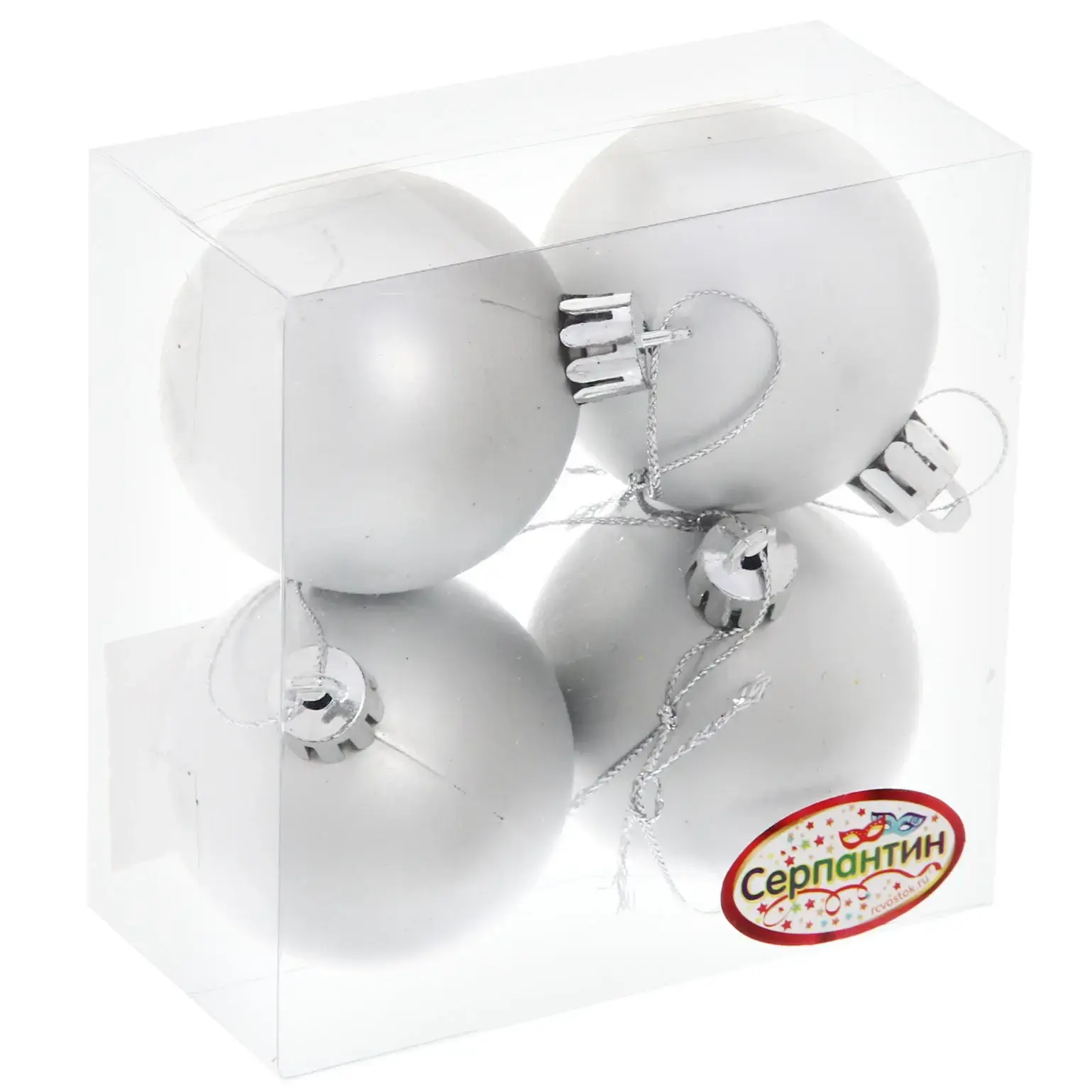 Диаметр каждого шара составляет 5 см — оптимальный размер для стандартных новогодних ёлок. Материал изготовления — ударопрочный пластик с матовым покрытием. В комплекте 4 идентичных шара серебристого цвета. Металлические крепления надёжно фиксируются на ветках.