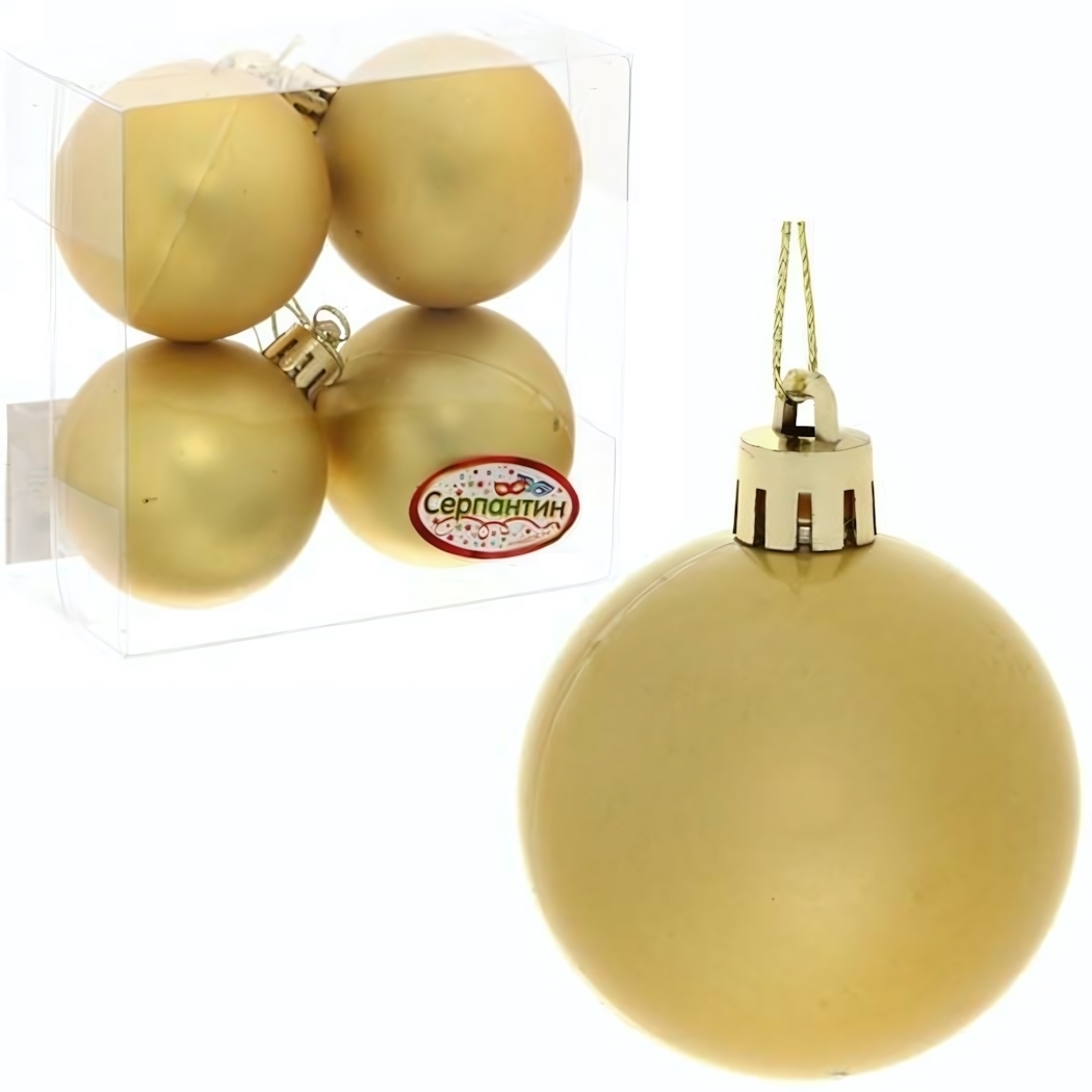 Количество: 4 штуки. Диаметр каждого шара – 5 см. Цвет – золотой матовый. Материал – ПВХ с металлическим держателем и золотой подвесной нитью.