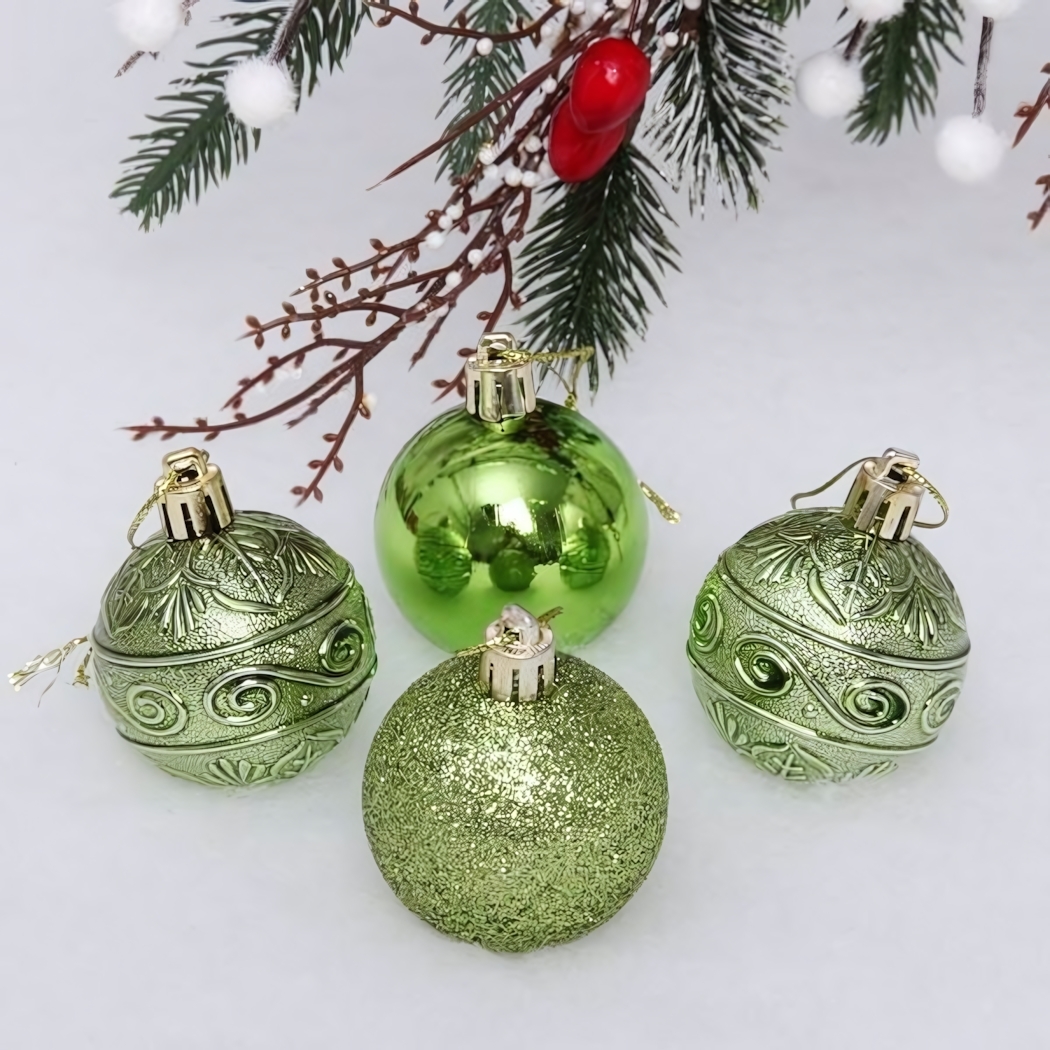 Этот набор из четырех новогодних шаров различных оттенков зеленого цвета станет идеальным выбором для украшения вашей елки. Разнообразие фактур – глянцевая, матовая с блестками и рельефные узоры – создает эффектный визуальный контраст.