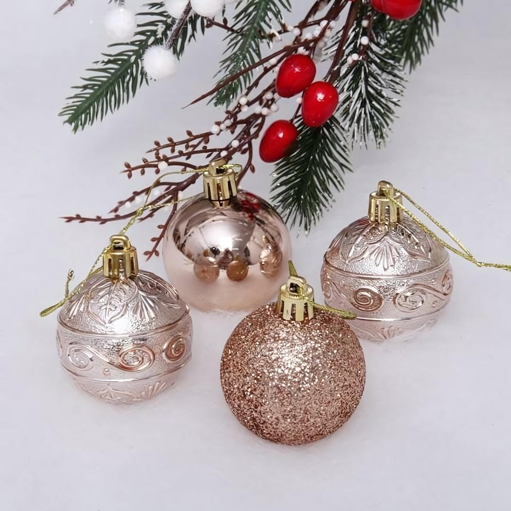 Преобразите вашу новогоднюю елку с помощью изысканного набора шаров "Микс фактур". Четыре уникальных дизайна в благородном оттенке шампань создадут неповторимую атмосферу праздника и уюта.