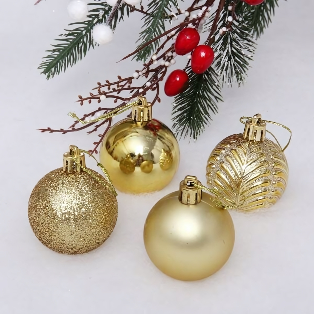 Украсьте вашу ёлку и интерьер с изысканным набором золотых шаров диаметром 5 см. В комплекте 4 уникальных украшения: глянцевый, матовый, с блестками и рифлёным узором в виде листьев. Благодаря разнообразию фактур этот набор создаёт глубокую игру света и добавляет атмосферу тепла и уюта. Золотой цвет символизирует роскошь и праздничное настроение, а разные поверхности делают композицию объемной и выразительной.