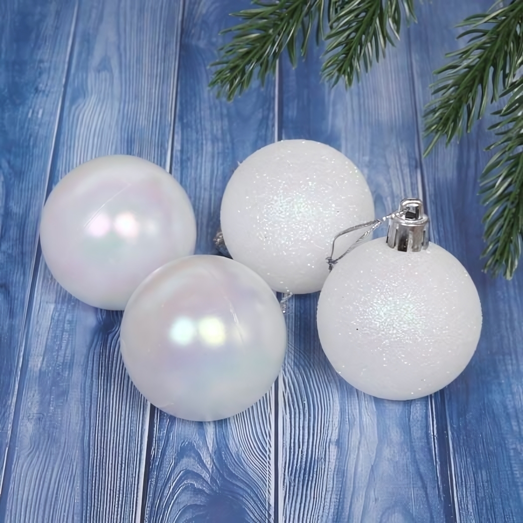 Сочетайте шары разных текстур для создания объемной композиции. Распределите их равномерно по елке или создайте акцентные группы. Бело-перламутровая гамма гармонично сочетается с классическими золотыми и серебряными украшениями.
