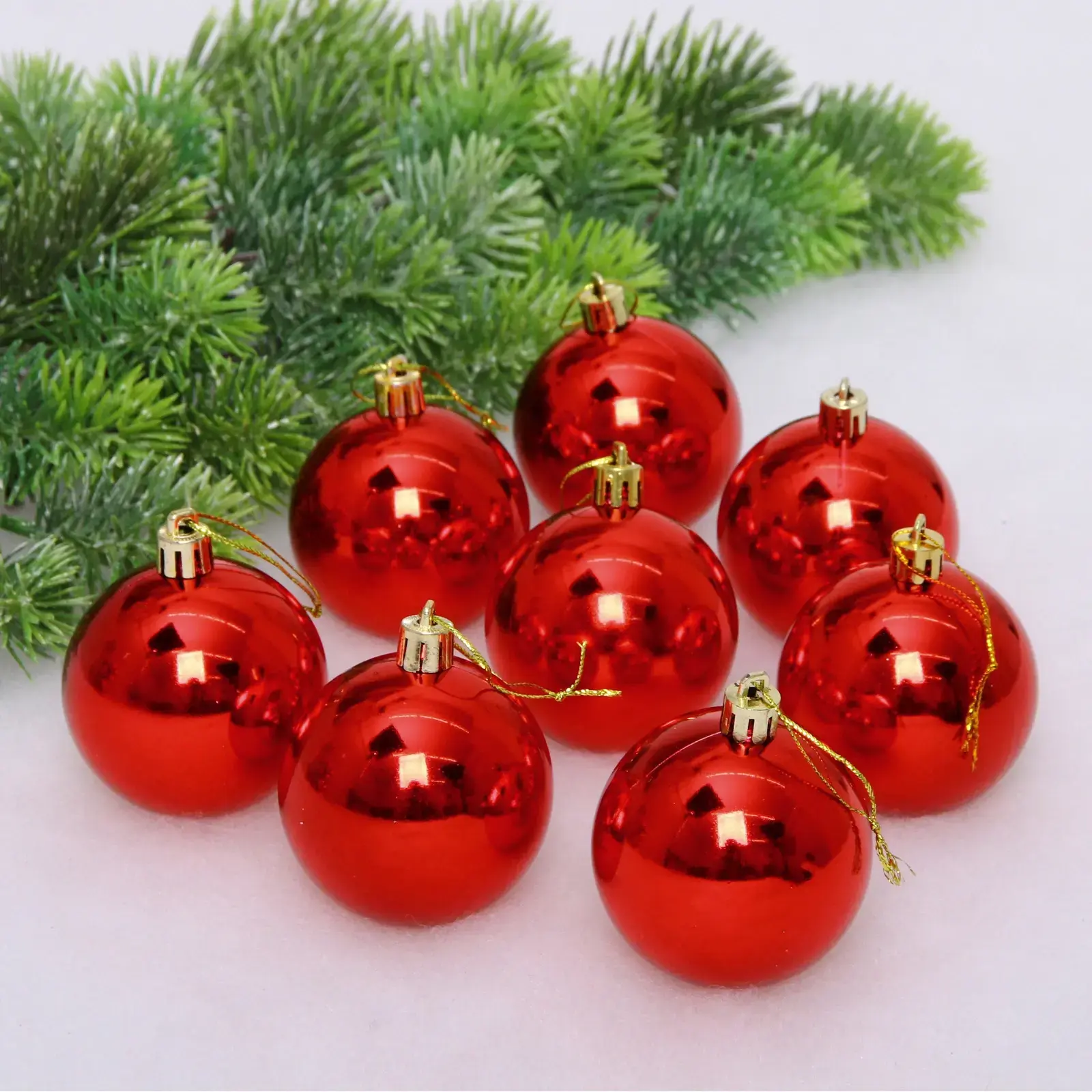 Набор из 24 глянцевых шаров превратит вашу ёлку в сияющий шедевр. Красные сферы диаметром 6 см с золотыми петлями создают элегантный праздничный ансамбль, подходящий для дома и офиса.